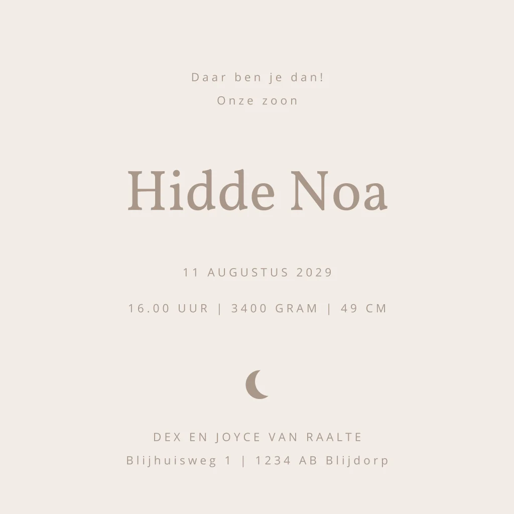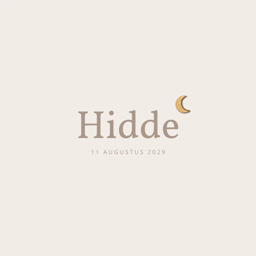 Geboortekaartje voor een jongen met écht houten maantje. Op dit basic babykaartje Hidde de naam en geboortedatum in een rustige grijstint, mooi in combinatie met de lichte achtergrond. Speciaal aan dit kaartje zijn de afgeronde hoeken.