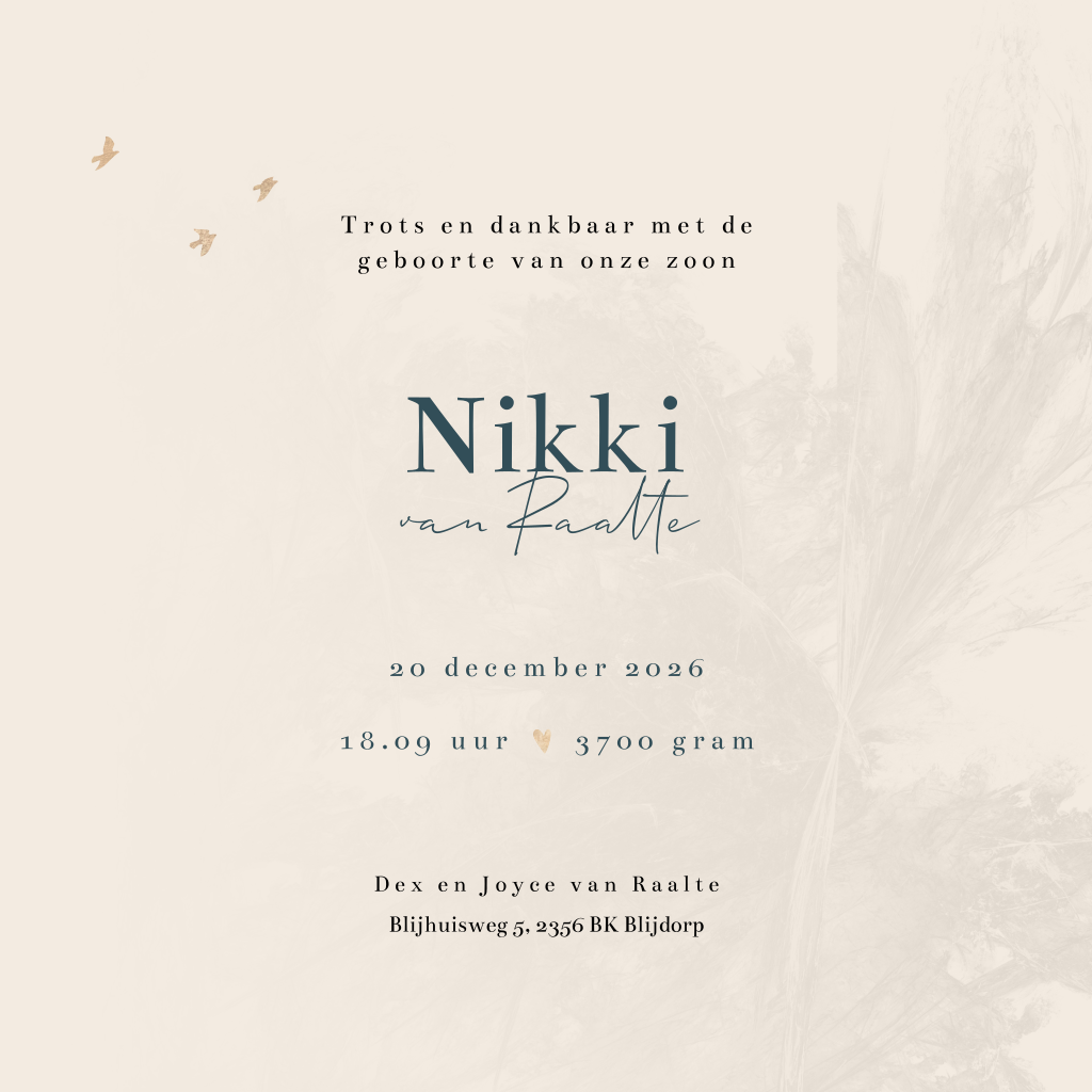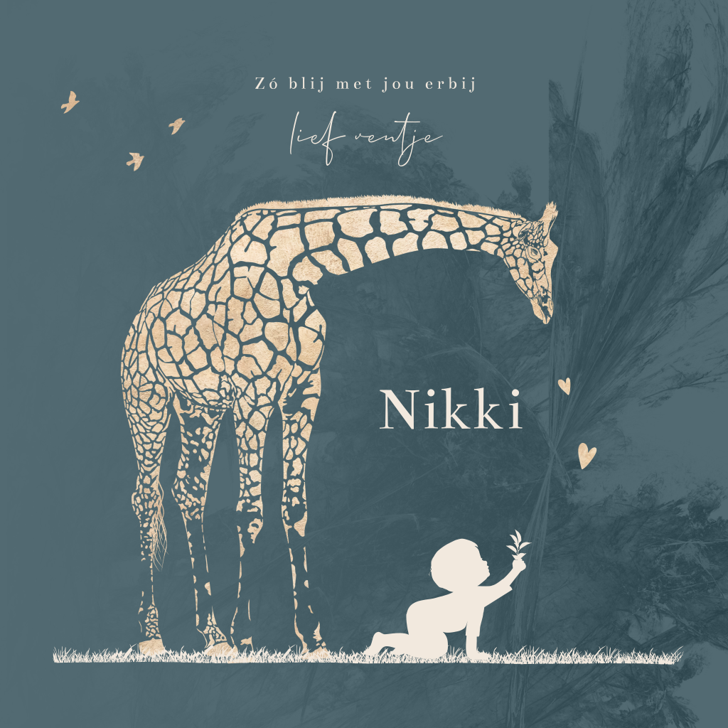Een lief ventje geboren! Stuur dit geweldige jongens geboortekaartje naar al je bekenden. Op dit dieren kaartje Nikki een giraffe, kijkend naar het silhouetje van jullie zoon. Al kruipend op het gras, met een takje in zijn hand. Dit jungle kaartje heeft afgeronde hoeken, wat het nóg een tikje specialer maakt.