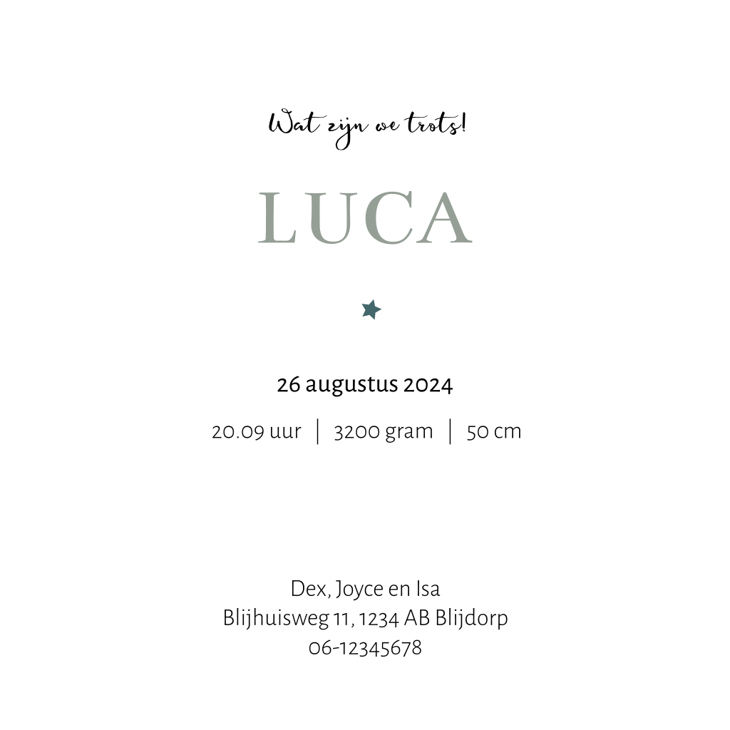 Een rustig geboortekaartje voor een jongen met een lief uiltje. Op dit babykaartje Luca staat een mooie uil in groen tinten het kleine uiltje heeft de oogjes dicht. Rondom het uiltje staan kleine sterretjes. Deze kaart is eenvoudig aan te passen.