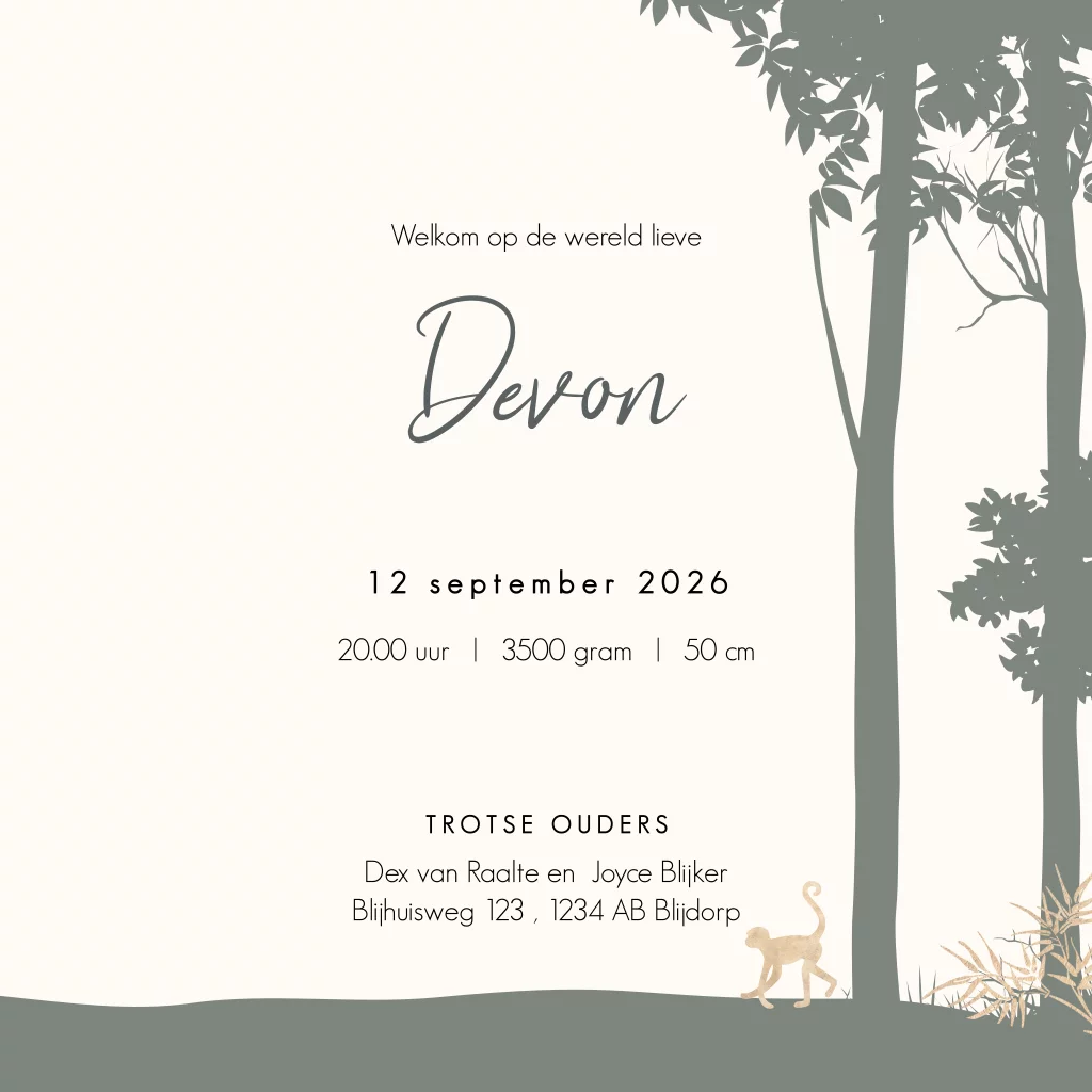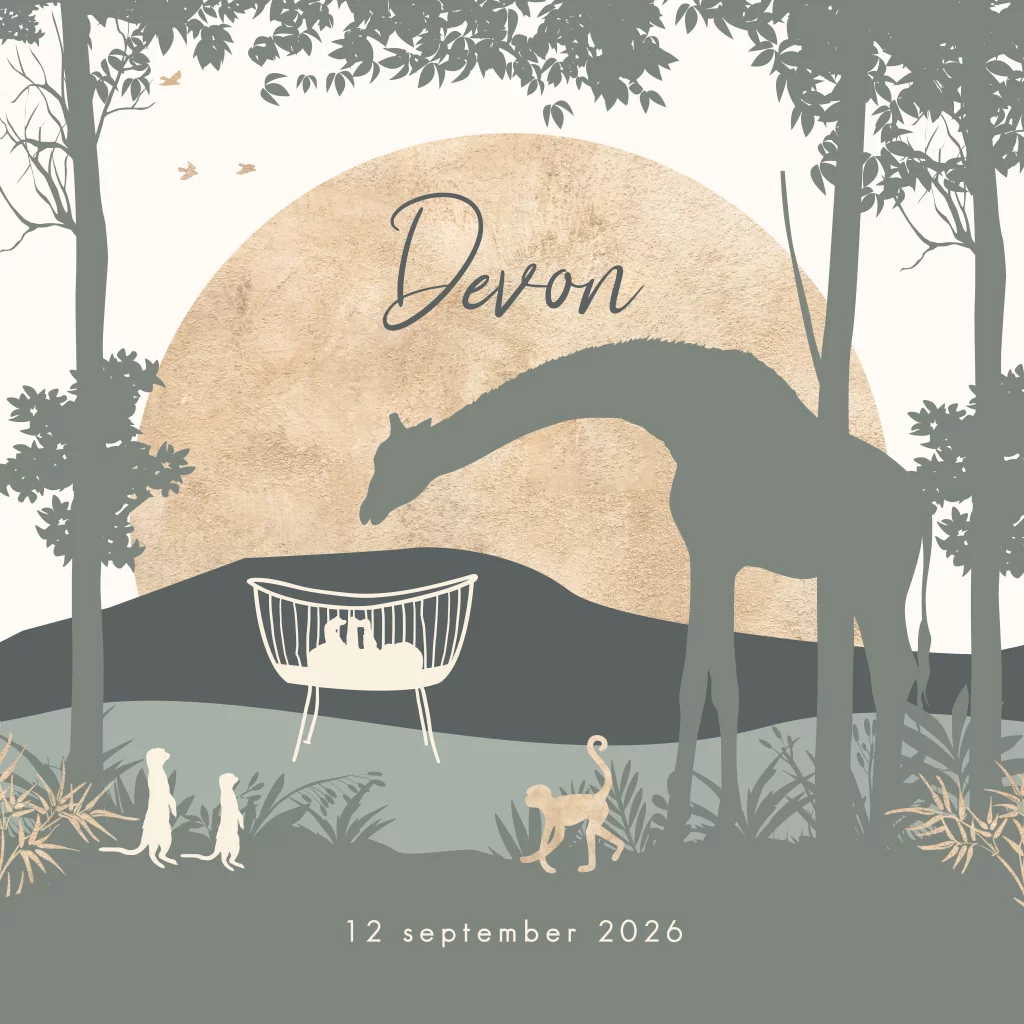 Op safari met dit silhouet geboortekaartje voor een zoon! Op dit jongenskaartje Devon een giraffe die in het wiegje van de kleine jongen kijkt. Op de achtergrond een opkomende zon. Verder op dit kaartje stokstaartjes, vogels en een aapje tussen de bomen en het struikgewas.