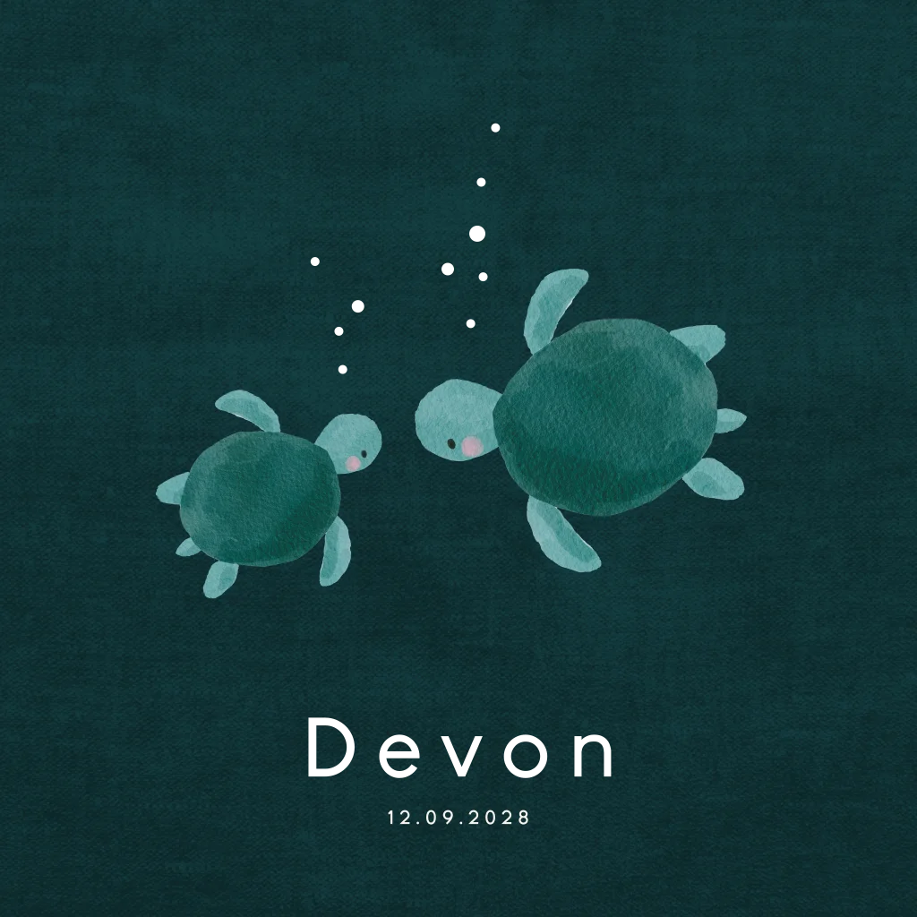 Op zoek naar een rustig maar lief geboortekaartje voor jullie kleine jongen? Bekijk dan eens dit geboortekaartje met foliedruk en twee geschilderde aquarel schildpadden onder water. Dit geboortekaartje voor een jongen is zeker ook geschikt voor een tweede kindje, een klein broertje. Pas dit geboortekaartje zelf eenvoudig aan in de editor. Hulp nodig? Bel, mail of chat ons gerust. Wij helpen je graag!