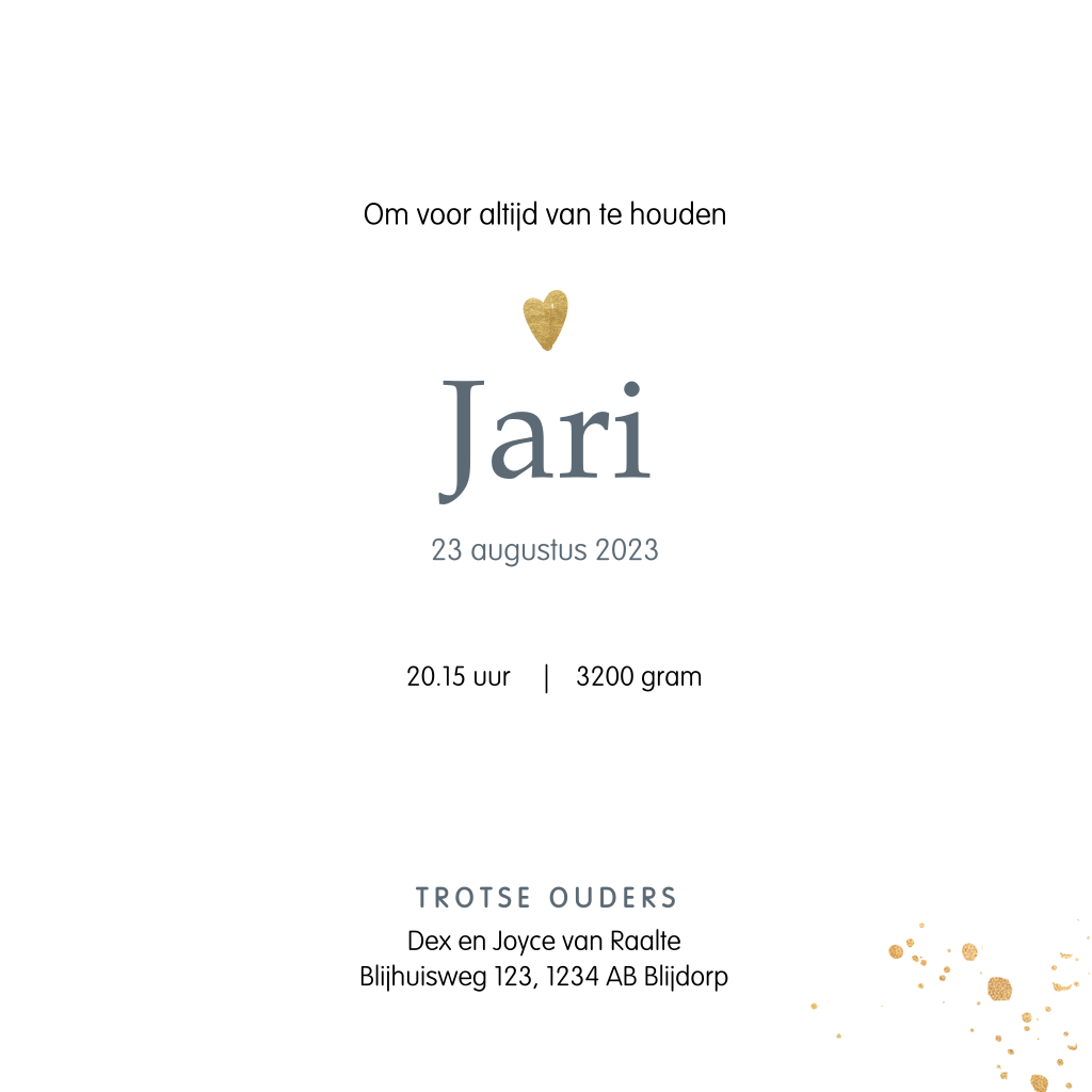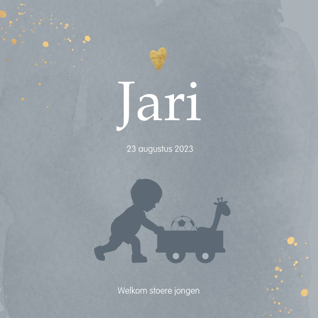 Hip geboortekaartje voor een jongen met een grijsblauwe aquarel achtergrond, gouden spetters en gouden hartje. Op dit kaartje Jari staat een silhouet van een jongetje die een karretje duwt waarin een voetbal en een knuffeltje liggen. Ook mogelijk met een ander silhouet, dit is aan te passen in de editor.