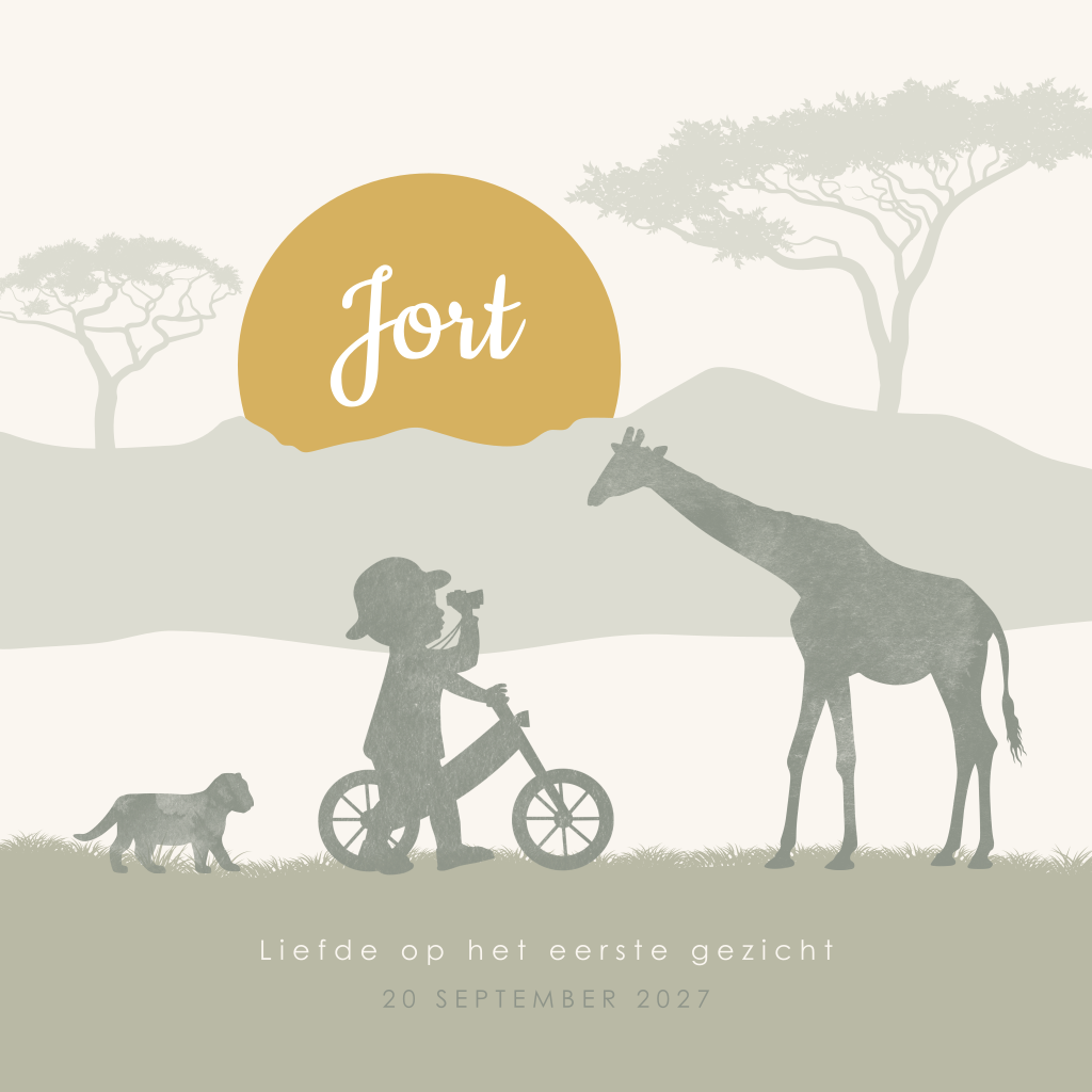 Jungle geboortekaartje voor een jongen. Op dit geboortekaartje een savanne landschap met ondergaande zon. Dit geboortekaartje Jort is perfect voor een avontuurlijke baby. Je ziet een silhouet van een jongetje op een loopfietsje met verrekijker en een giraffe en leeuwen welpje. Het jungle landschap heeft mooie greige ton sur ton kleuren en in de zon staat de babynaam. Pas dit babykaartje geheel naar eigen wens aan in de editor. Hulp nodig? Wij helpen je graag!