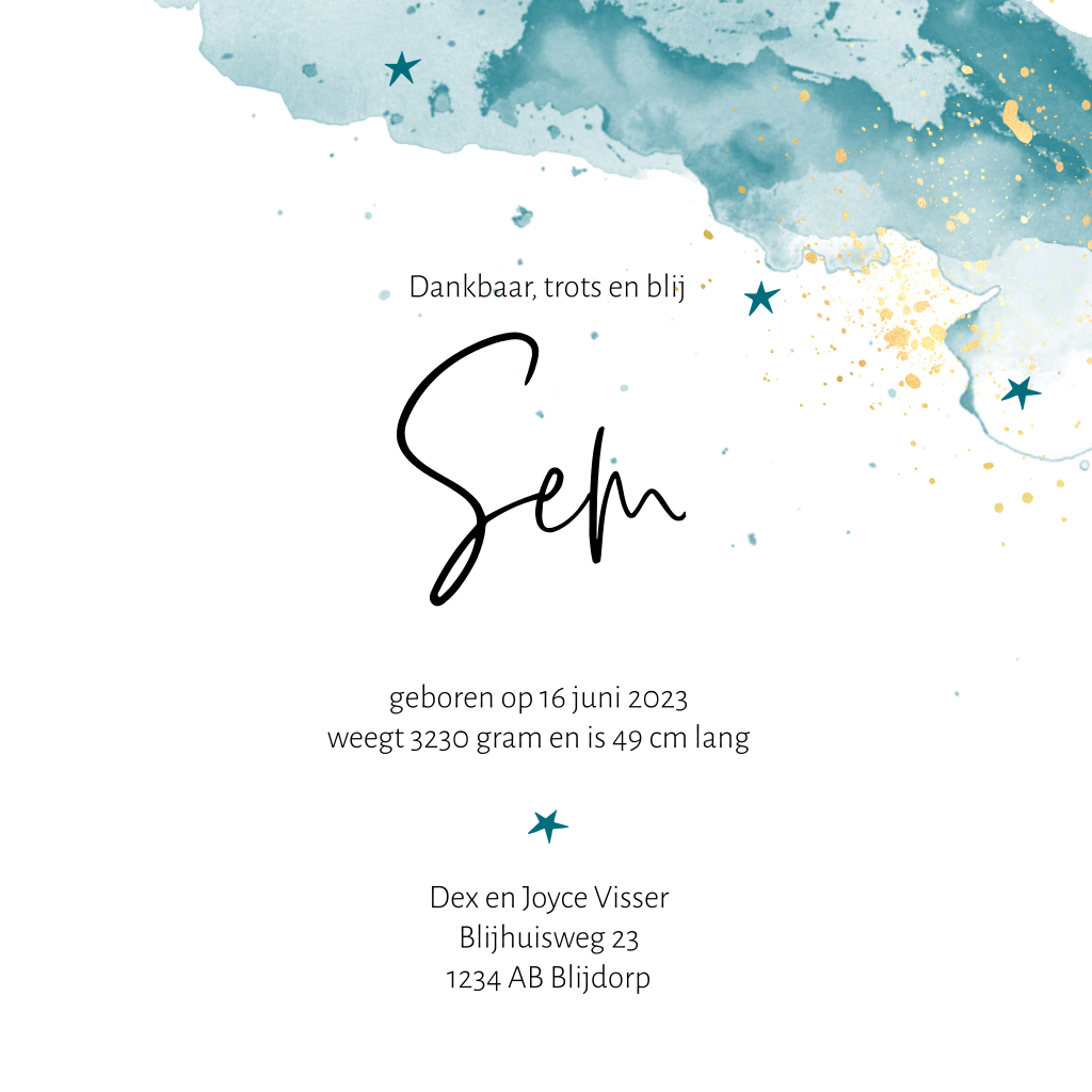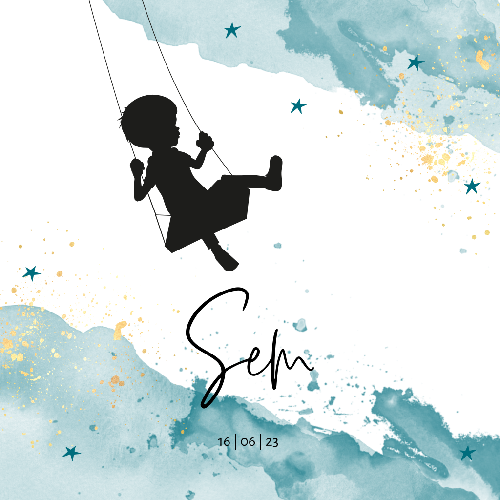 Silhouet geboortekaartje met een aquarel thema voor een jongen. Naaste de opvallende achtergrond, springt het silhouet van een jongen op een schommel meteen op. Dit babykaartje Sem heeft op de voorkant een grote blauw petrol watercolor vlek waar kleine goudkleurige spetters en sterretjes door heen lopen. De babynaam staat op de kaart in sierlijke letters geschreven. Het ontwerp van deze kaart is gemakkelijk aan te passen.