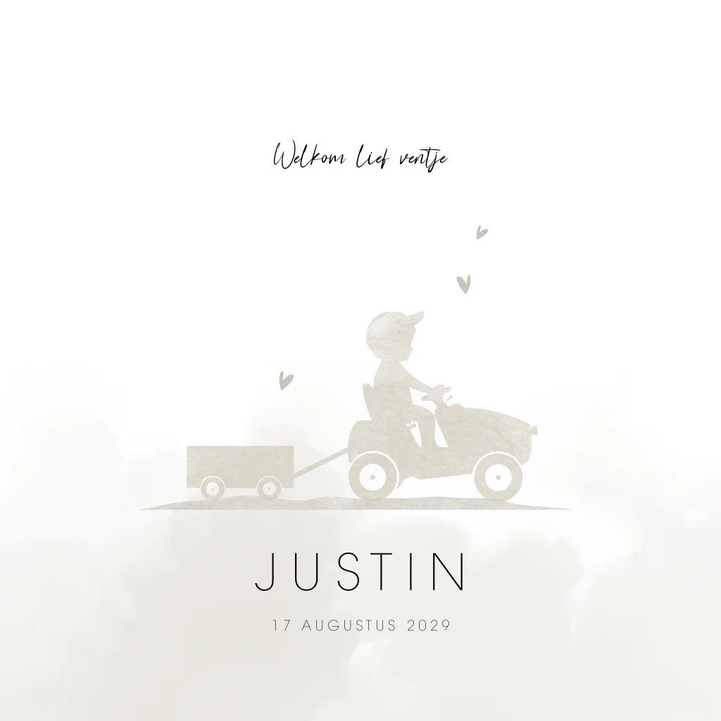 Geef je zoon een uniek geboortekaartje met dit silhouet kaartje. Op dit jongenskaartje Justin zie je een silhouet van een jongen met een petje op, rijdend op een tractor. Op de achtergrond een beige aquarel met hartjes. Pas dit kaartje naar je eigen smaak aan in de editor. Dit kaartje is ook mogelijk voor een andere gezinssamenstelling of met een ander silhouet.