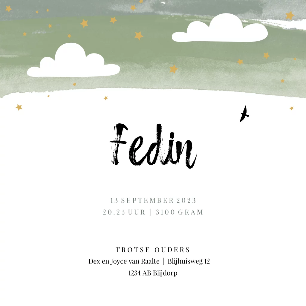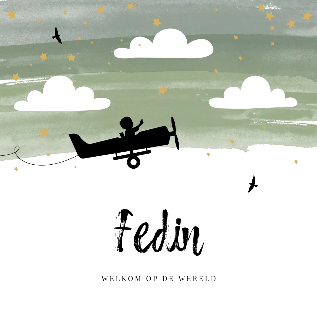 Silhouet geboortekaartje voor een zoon. Op dit kaartje Fedin zie je een jongetje in een vliegtuig. Op de achtergrond een groene aquarel. Verder op dit kaartje wolken en kleine sterretjes. Teksten en kleuren zijn aan te passen in de editor.