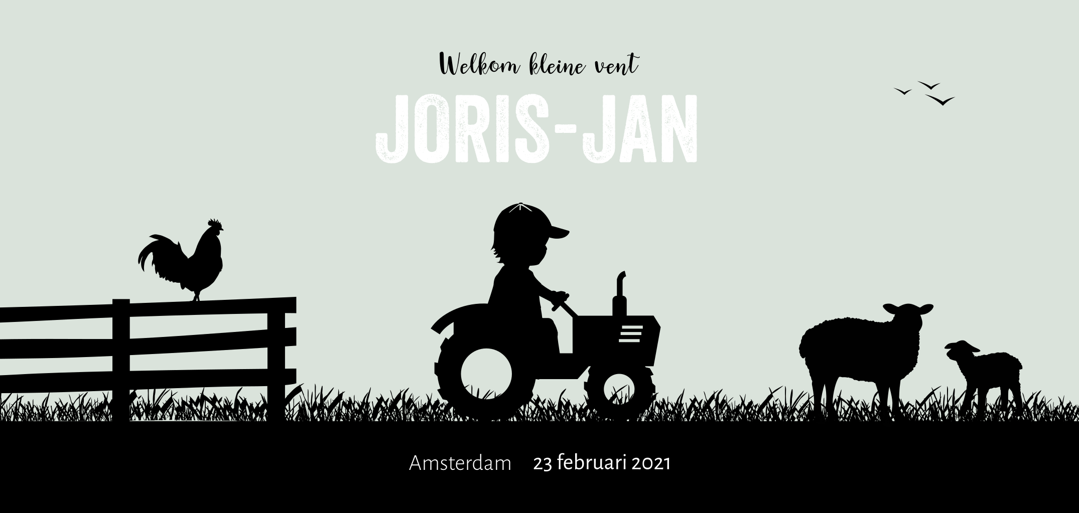 Boerderij geboortekaartje met boerderijdieren en een jongen op een tractor. Op dit hippe silhouet geboortekaartje staan schaapjes en een haan op een boeren hek. De kaart is naar eigen wens aan te passen.