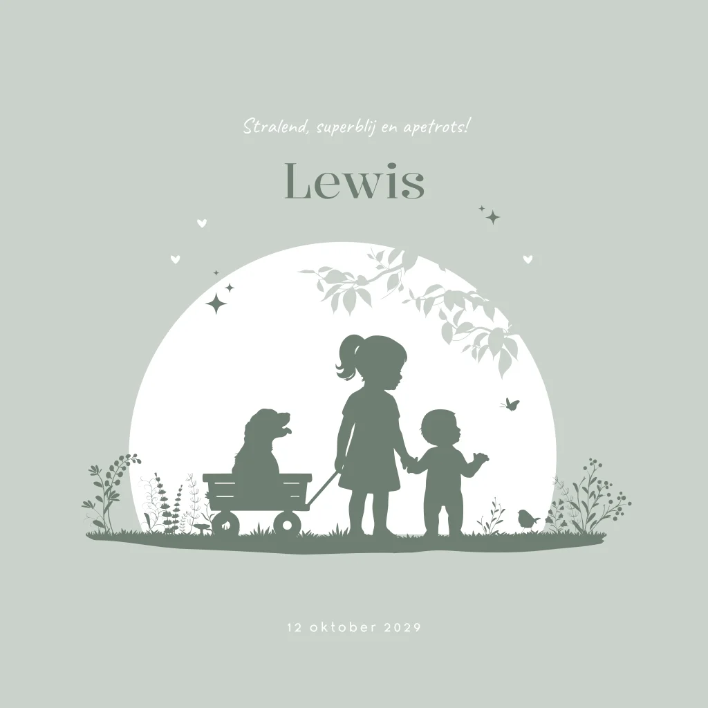 Dit geboortekaartje Lewis is ideaal voor ouders die op zoek zijn naar een ontwerp met een toevoeging van een huisdier, een hond. Op dit kaartje voor een jongen zie je een silhouet van grote zus, het kleine broertje en een hond in een karretje. De toevoeging van de sparkles en hartjes geven het kaartje voor jullie zoon een speelse uitstraling.