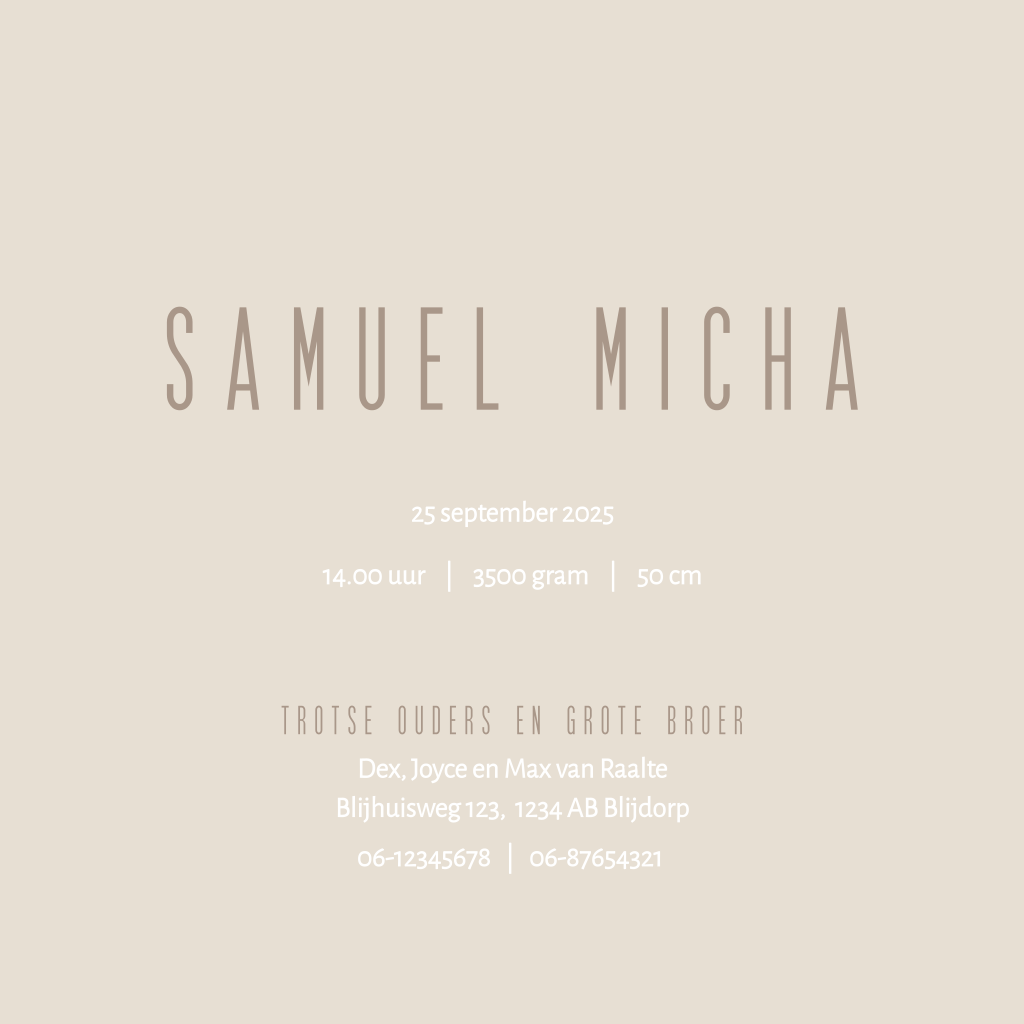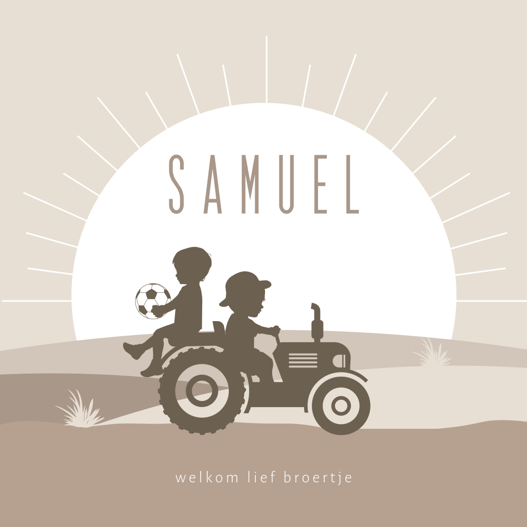 Een trendy silhouet geboortekaartje voor een baby broertje. Door het glooiende landschap en de zonnestralen komt het silhouet erg mooi naar voren. Twee jongens op een trekker, met daarboven de babynaam Samuel in een strak lettertype. Alle teksten en kleuren zijn naar eigen smaak aan te passen in onze editor. Hulp nodig? Wij helpen je graag verder.