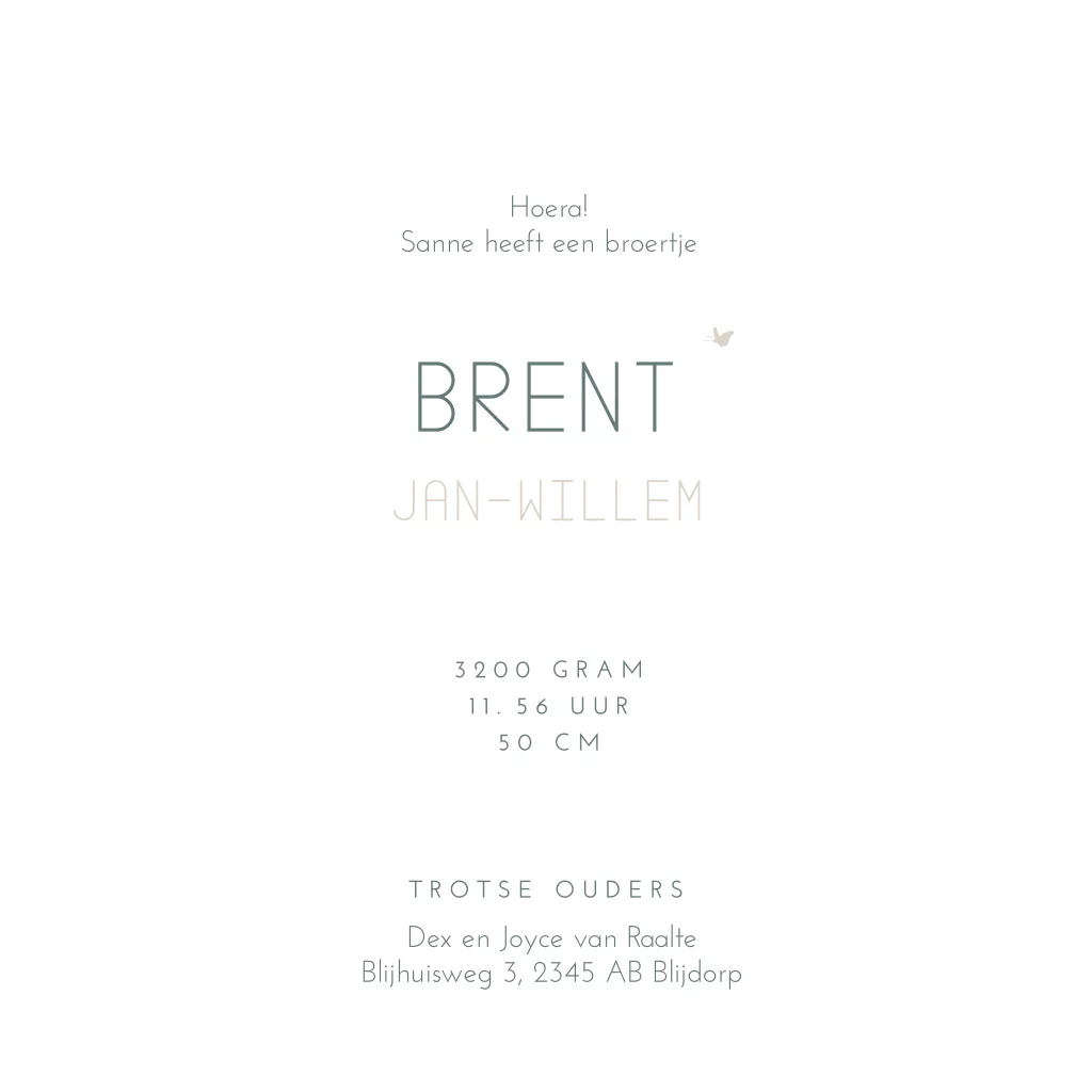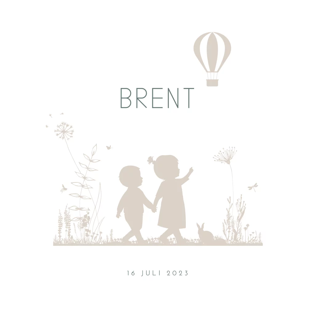 Lief silhouet geboortekaartje voor een tweede kindje. Op dit babykaartje met de naam Brent, wandelen een grote zus en een klein baby broertje tussen de mooie veldbloemen. Het meisje wijst naar een luchtballon en in het gras zit een klein konijntje. Een lief en vrolijk kaartje, erg geschikt voor een jongetje die in de lente of in de zomer geboren wordt. Pas dit kaartje naar je eigen smaak aan in de editor.