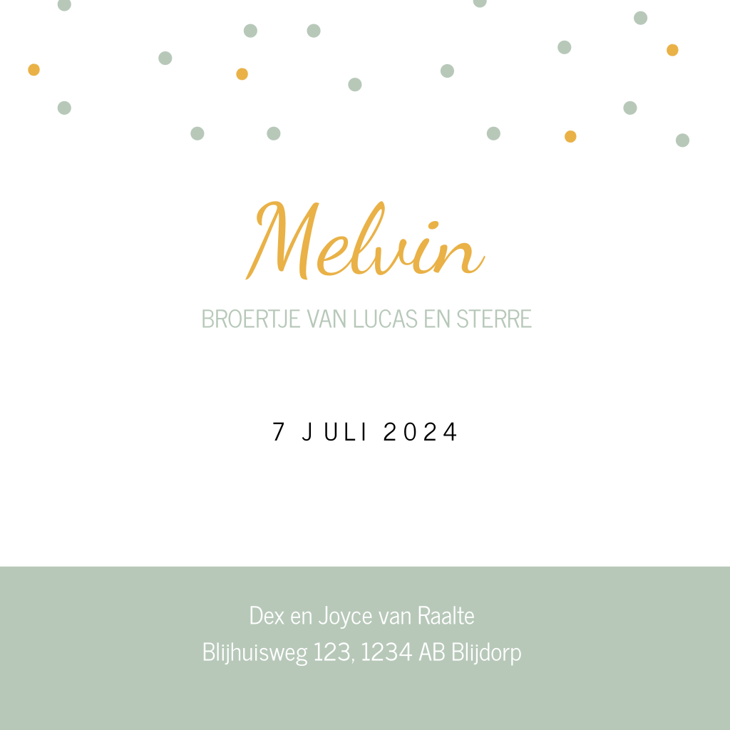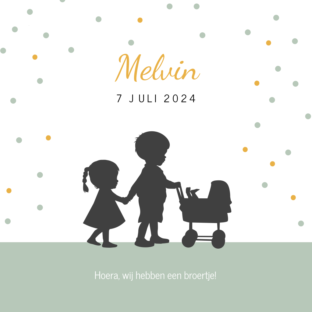 Silhouet geboortekaartje voor een derde kindje een baby broertje. Op dit kaartje staan een zus en een broer hand in hand. In de wandelwagen wieg zie je de baby voetjes van een klein broertje. De stippen op geboortekaartje Melvin maken een vrolijk geheel.