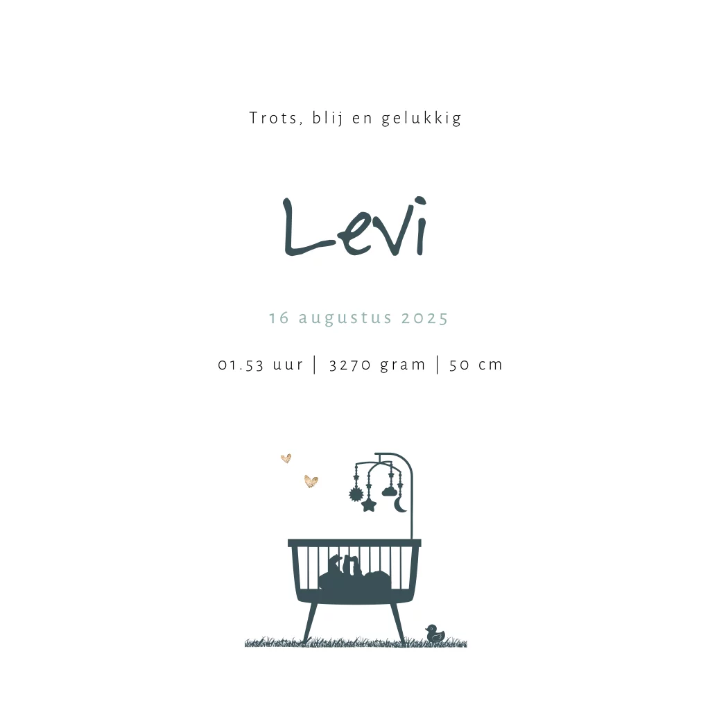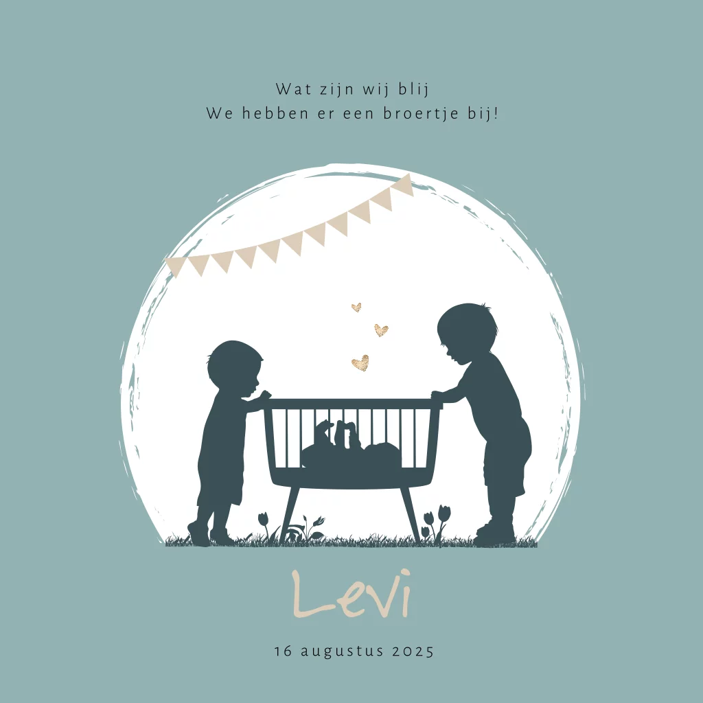Silhouet geboortekaartje voor een derde zoon met de silhouetten van 3 jongens. Op dit babykaartje Levi staan 2 grote broers die kijken in een wiegje waarin hun kleine broertje ligt. Verder op dit kaartje een vrolijke slinger en kleine hartjes. Teksten en kleuren, evenals de silhouetten zijn aan te passen in de editor. Ook mogelijk voor een andere gezinssamenstelling.