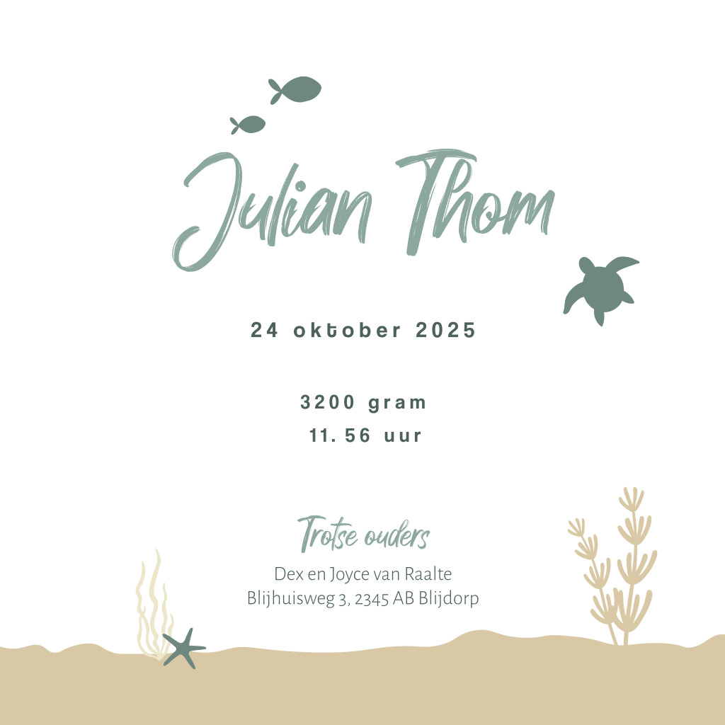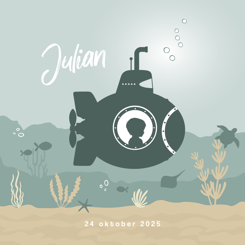 Silhouet geboortekaartje met een onderzeeër, zeedieren en waterplanten. In de duikboot zit een jongetje. Dit geboortekaartje Julian voor een zoon in onderwaterwereld thema kun je naar je eigen smaak aanpassen.