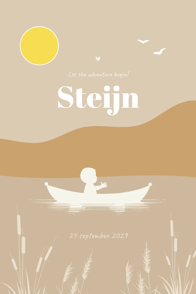 Een prachtig silhouet geboortekaartje met een lieve illustratie van een jongetje in een bootje. Dit geboortekaartje Steijn voor jullie zoon heeft neutrale en rustige kleurtinten. Het goudfolie zorgt voor een luxe touch. Met onze online editor is het mogelijk om het kaartje helemaal naar jullie wens aan te passen. De biotop envelopkleur maakt dit kaartje helemaal in stijl af.