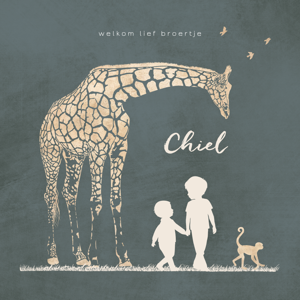 Dieren geboortekaartje voor een zoon: een broertje. Op dit silhouet babykaartje Chiel een giraf die boven de twee broertjes staat. Grote broer en zijn kleine broertje wandelen hand in hand met een klein aapje er naast. De ruwe donkerblauwe achtergrond geeft dit kaartje een stoere uitstraling.