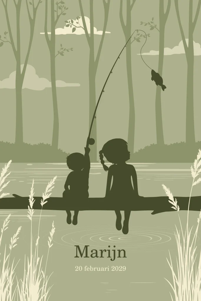 Geboortekaartje voor een tweede kindje, een broertje. Op dit geboortekaartje Marijn zie je een silhouet van een grote zus met haar kleine broertje. Ze zijn samen aan het vissen en hebben beet! Op de achtergrond zie je het bos. Dit silhouet kaartje is gemakkelijk aan te passen en ook mogelijk in een andere gezinssamenstelling. Hulp nodig? Neem contact met ons op!