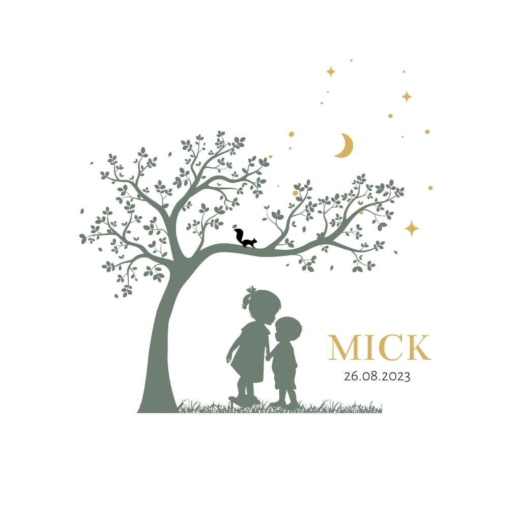 Een hip silhouet geboortekaartje voor een baby broertje. Op dit silhouet kaartje Mick staan een grote zus met haar kleine baby broertje. De zus geeft het kleine jongetje een kusje.
