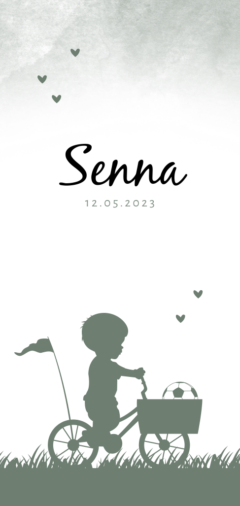 Hip geboortekaartje voor een zoon. Op dit kaartje Senna staat het silhouet van een jongen op de fiets. Voorin het bakje een voetbal en een vlaggetje achterop. Aan de bovenkant een lichte aquarel en enkele kleine hartjes. De kleuren, teksten en het silhouet zijn aan te passen in de editor.