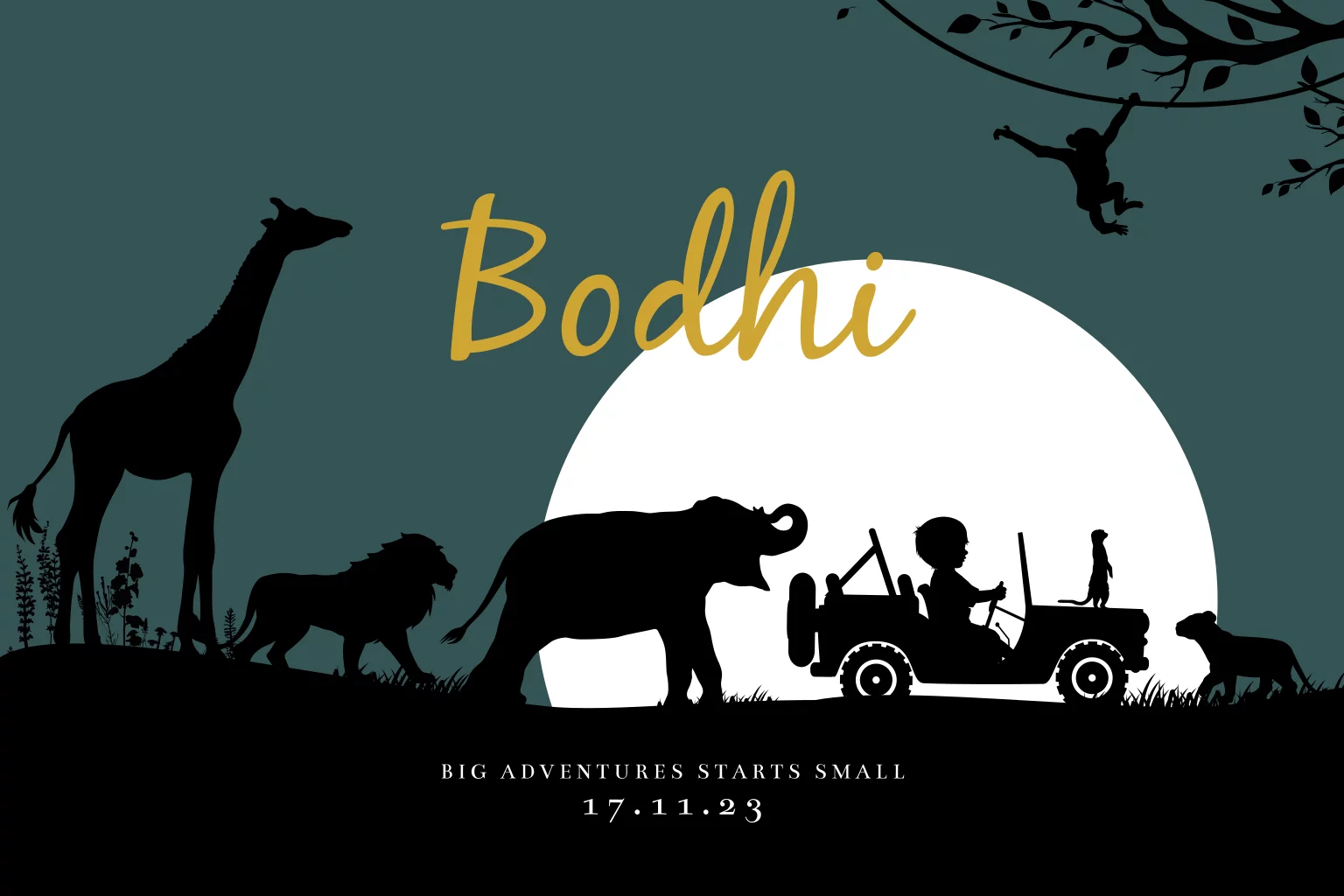 Avontuurlijk jungle silhouet geboortekaartje voor een zoon. Op dit hippe kaartje Bodhi zie je een jongen rijdend in een safari jeep met om hem heen verschillende dieren, zoals een olifant, leeuw, giraffe en een slingerende aap. De kleuren op dit kaartje, evenals de silhouetten, zijn aan te passen.