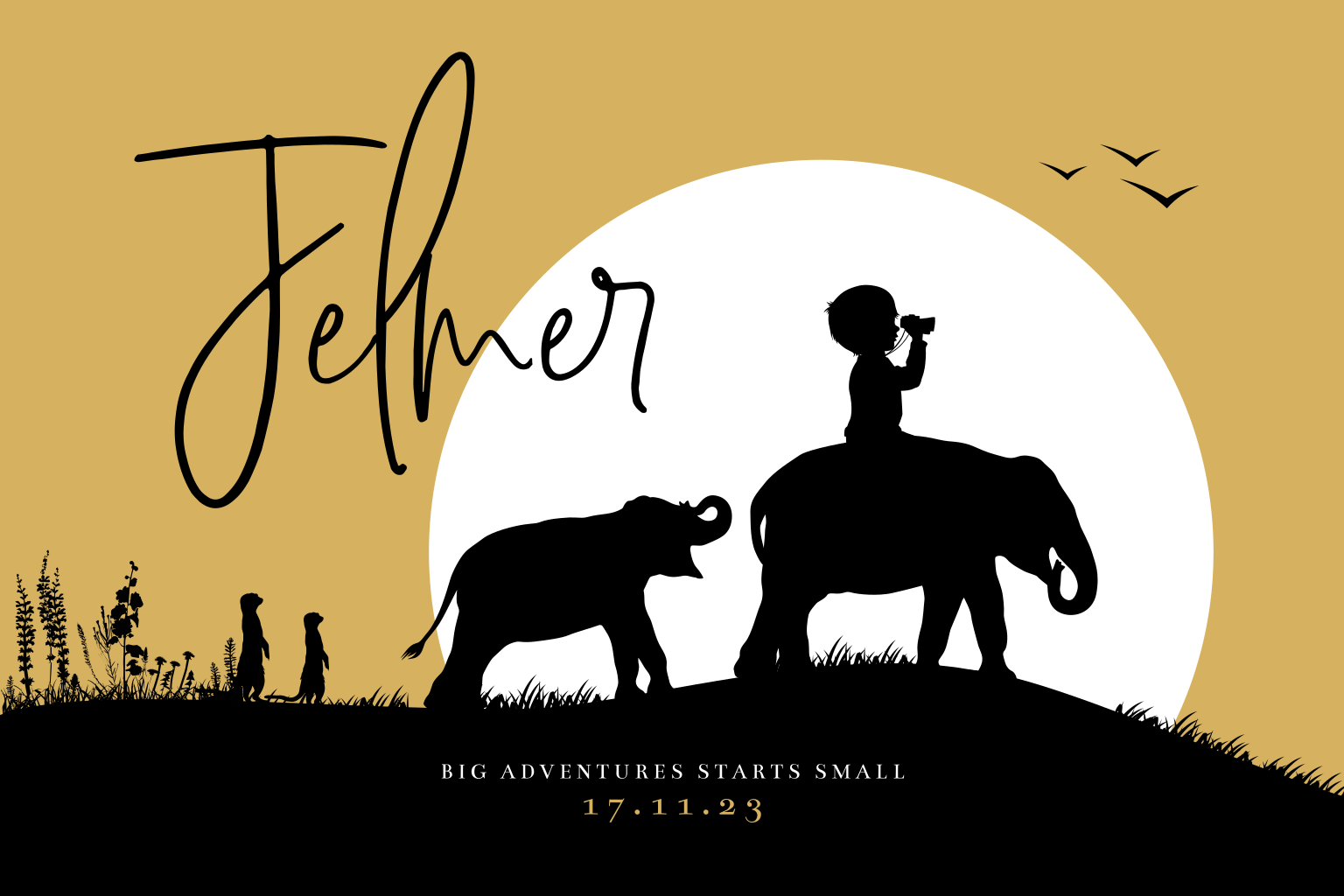 Avontuurlijk silhouet geboortekaartje voor een jongen in safari stijl. Op dit hippe kaartje Jelmer staat een jongetje rijdend op een olifant met in zijn hand een verrekijker. De kleuren en teksten evenals de silhouetten zijn aan te passen.