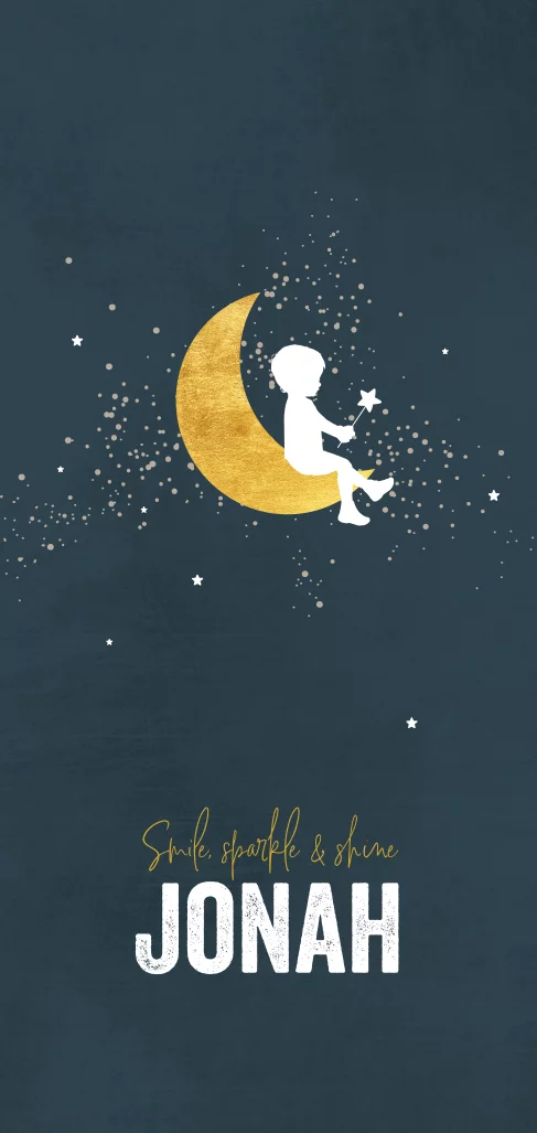 Smile, sparkle and shine! Hip silhouet geboortekaartje voor een zoon. Op dit kaartje Jonah staat een jongetje die op de maan zit. Daar omheen kleine stipjes en sterretjes. Een mooie combinatie met de donkerblauwe achtergrond. Teksten en kleuren, evenals het silhouet, zijn aan te passen in de editor.