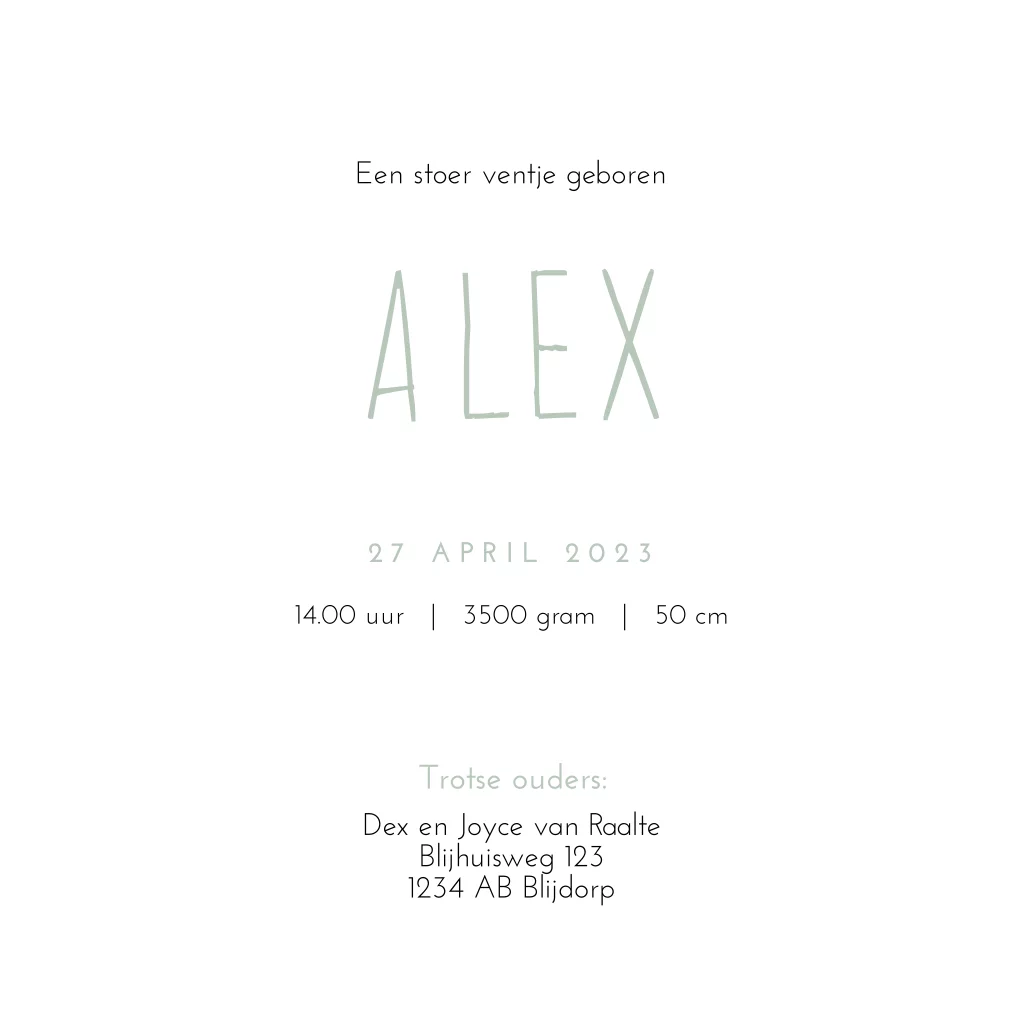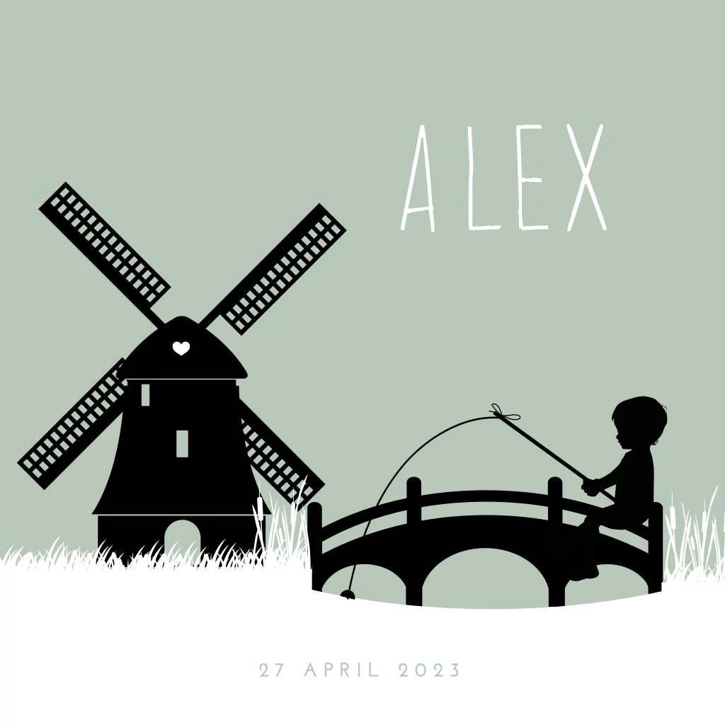 Hollands silhouet geboortekaartje voor een zoon. Op dit kaartje Alex zie je een jongetje die aan het vissen is op de brug bij een Hollandse molen. De teksten en kleuren zijn naar wens aan te passen in de editor.