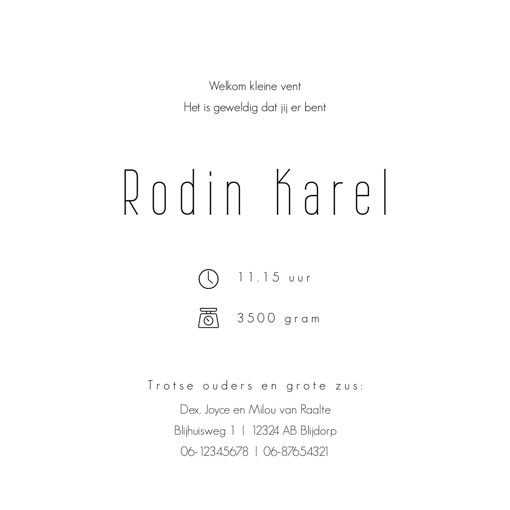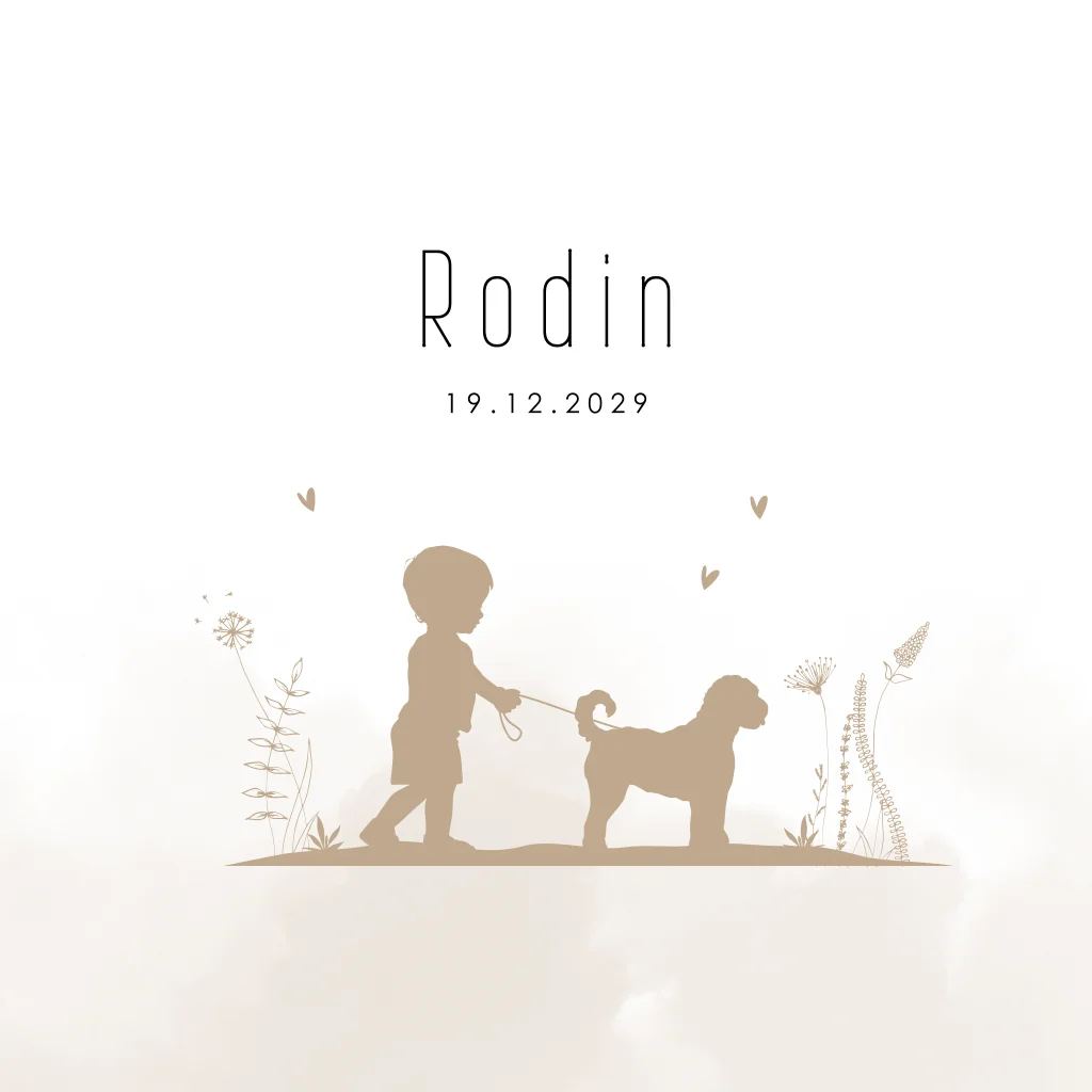 Silhouet geboortekaartje voor een jongetje. Op dit jongenskaartje Rodin staat een klein jongetje met aan de riem een hondje die hij aan het uitlaten is, superschattig! Teksten en kleuren, evenals de silhouetten zijn aan te passen in de editor. Ook mogelijk voor een andere gezinssamenstelling of bijvoorbeeld met een meisje. Dit geboortekaartje is geïnspireerd op het kaartje van Amber Eerland - Marleys wereld. Hulp nodig bij het aanpassen van deze kaart? We helpen je graag!