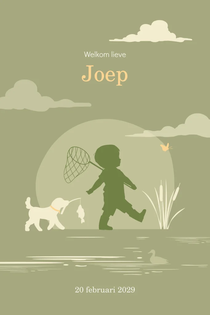 Jongens geboortekaartje met een silhouet van een jongen die gaat vissen met zijn hond. Ze lopen samen langs de waterkant met een vishengel en schepnet.