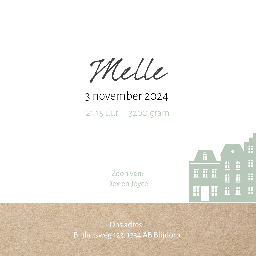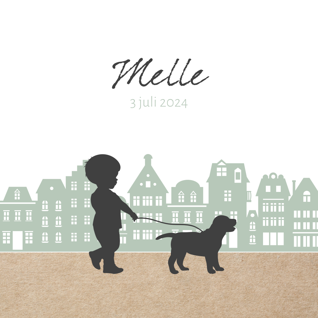 Geboortekaartje met een silhouet van een jongen en een hond aan de lijn. Het kaartje heeft een karton look aan de onderkant en Hollandse gevel huisjes op de achtergrond.