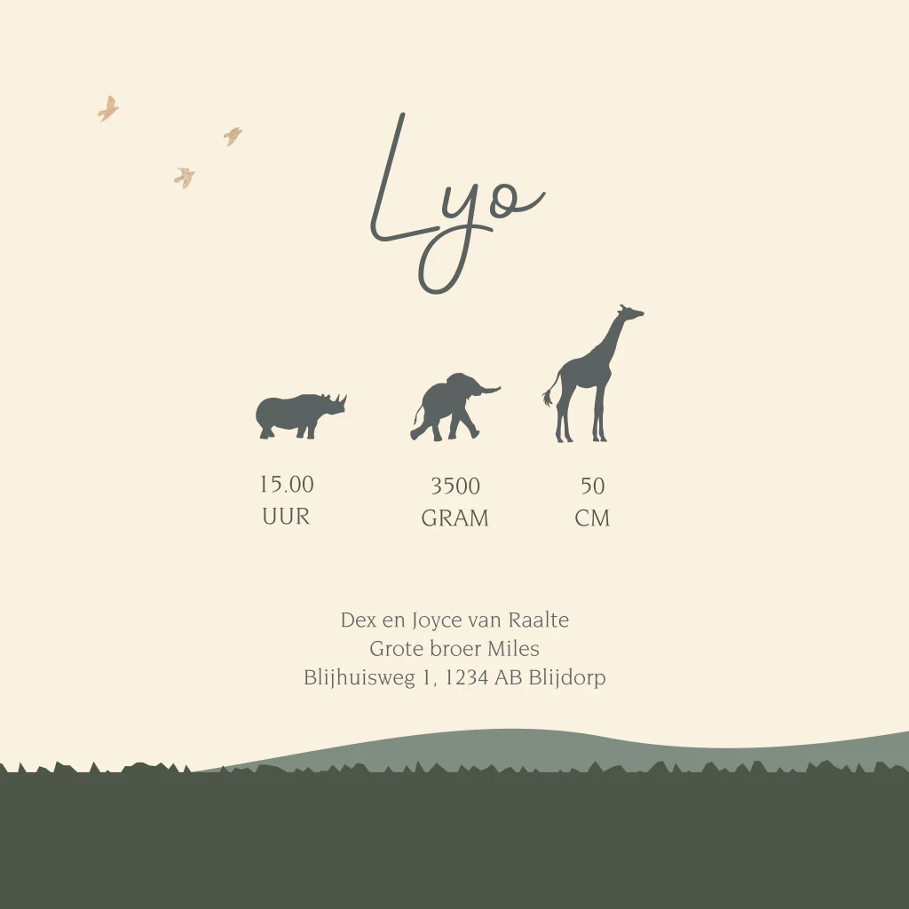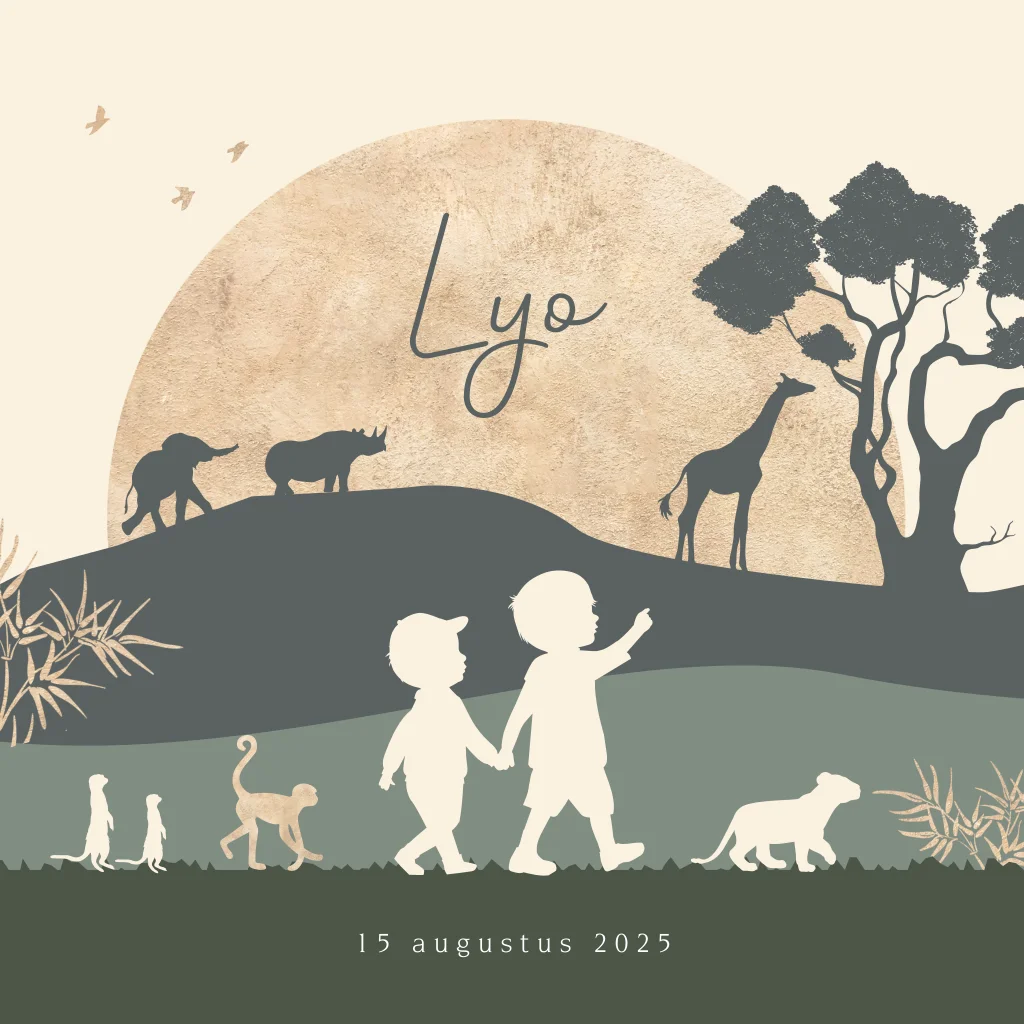 Gaaf silhouet geboortekaartje voor een broertje! Op dit jongenskaartje Lyo zie je twee broertjes wandelen tussen verschillende safari dieren, waaronder een aapje, stokstaartjes en een leeuwtje. Grote broer hand in hand met baby broertje, samen op avontuur in de jungle. Teksten, kleuren en silhouetten kun je eenvoudig aanpassen in de editor. Dit silhouet geboortekaartje is ook mogelijk voor een andere gezinssamenstelling.
