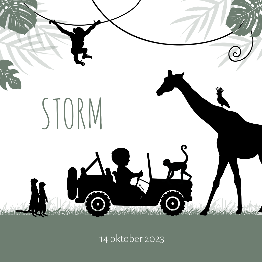 Hip jungle silhouet geboortekaartje voor een zoon. Op dit kaartje Storm zie je een jongen rijdend in een safari jeep met verschillende dieren, zoals een giraffe, aap en kaketoe. De kleuren op dit kaartje zijn aan te passen. Ook is dit kaartje mogelijk voor een andere gezinssamenstelling.
