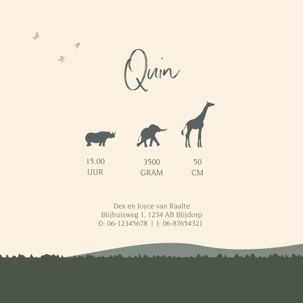 Op avontuur in de jungle. Silhouet geboortekaartje voor een zoon. Op dit jongenskaartje Quin zie je een jongetje met verrekijker wandelen tussen verschillende safari dieren, waaronder een aapje, stokstaartjes en een leeuwtje. Teksten, kleuren en silhouetten kun je eenvoudig aanpassen in de editor. Dit silhouet geboortekaartje is ook mogelijk voor een andere gezinssamenstelling.