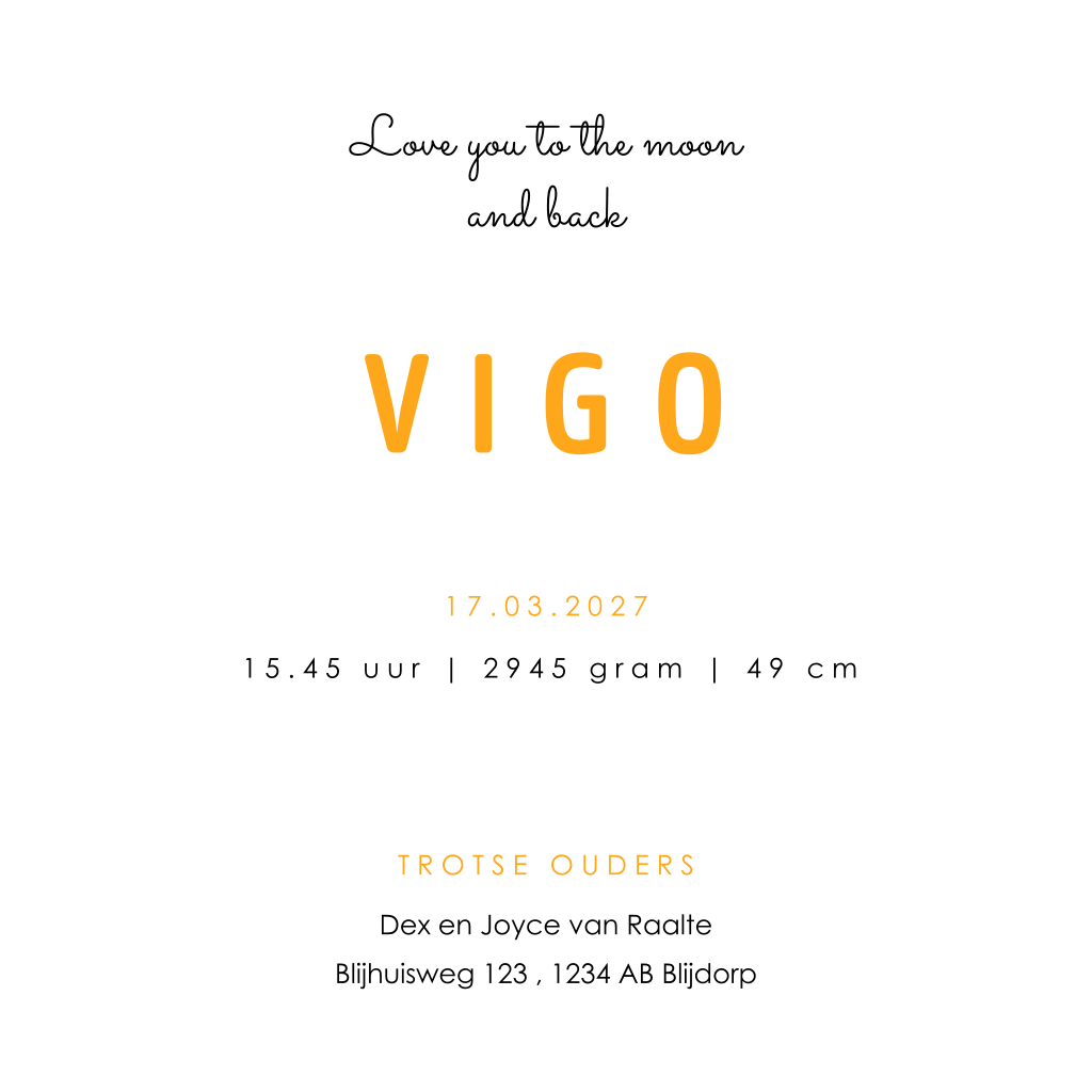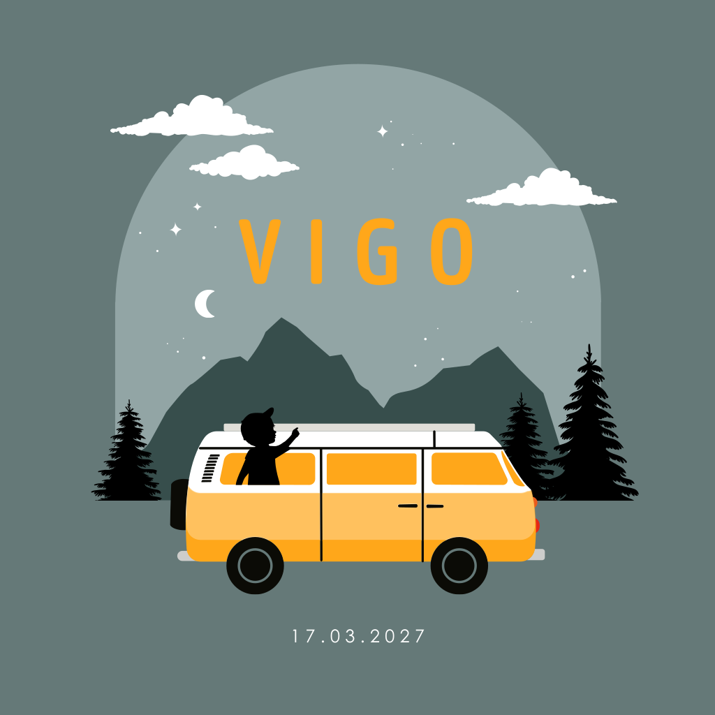 Dit unieke geboortekaartje Vigo voor jongens is stoer en avontuurlijk van sfeer. Het silhouet van een jongetje staat afgebeeld in een retro camperbusje, met de maan en sterren op de achtergrond. De rustige groen-grijze kleur van de achtergrond maakt het kaartje helemaal af. Op dit geboortekaartje kun je de teksten, kleuren en lettertypes naar je eigen smaak aanpassen in de editor. Het geboortekaartje is ook verkrijgbaar in een andere gezinssamenstelling.