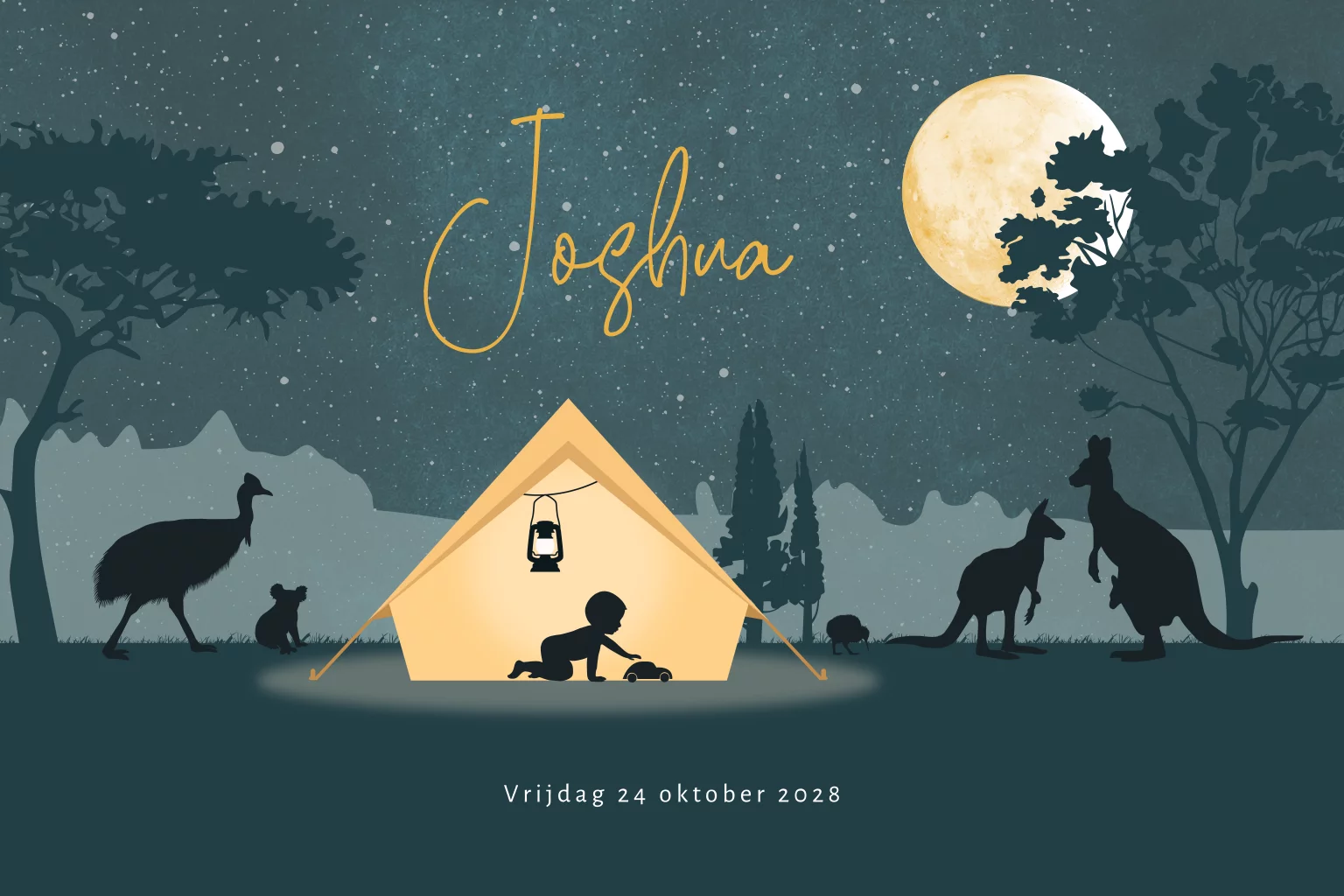 Zijn jullie fan van Australië of hebben jullie goede herinneringen aan een vakantie in Australië en wil je dit doorvoeren naar het geboortekaartje van jullie zoon? Dit avontuurlijke silhouet geboortekaartje Joshua voor een jongen heeft alles! Het is avontuurlijk met mooie silhouetten van typische dieren uit Australië, waaronder een kangoeroe, emoe en koala. Verder zie je een mooi avondlandschap met sterrenhemel en maan. In de verlichte tent zie je een silhouet van een jongen die aan het kamperen is in de wildernis.