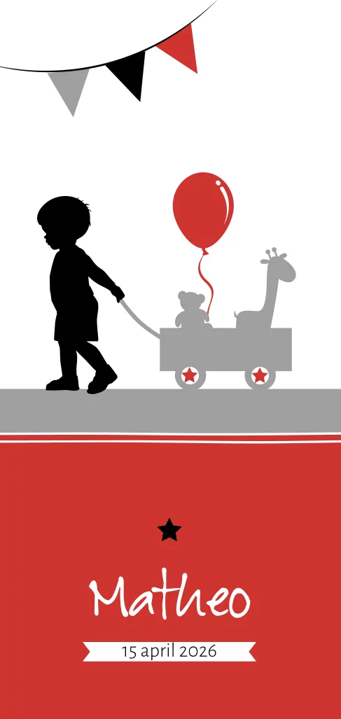 Een hip geboortekaartje voor een jongen. Op deze kaart loopt een jongetje met een speelgoed kar met daarin knuffeltjes en een ballon. De onderkant heeft een rood vlak waar de babynaam met witte letters mooi naar voren komt. Een slinger, sterretje en banner maken de kaart compleet.