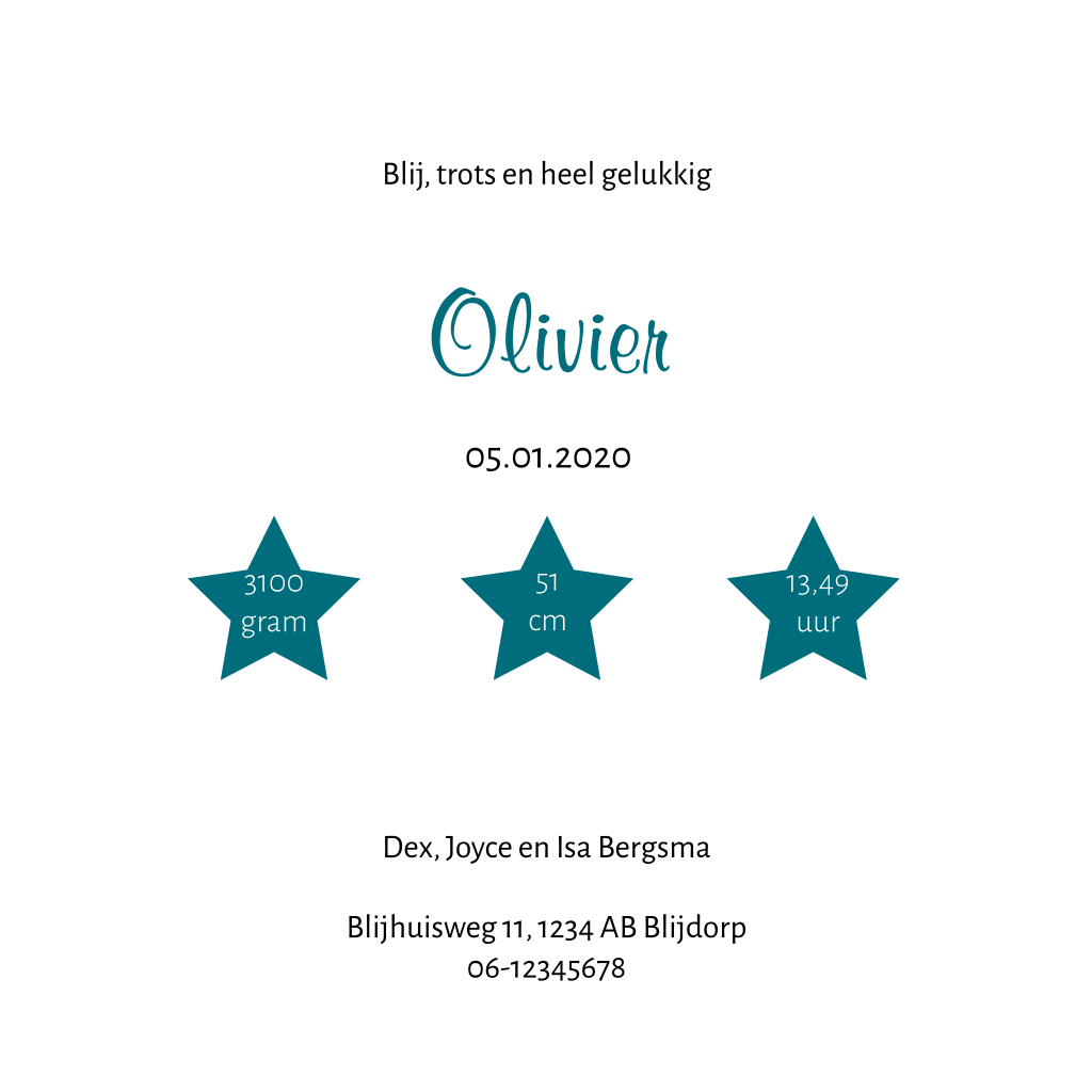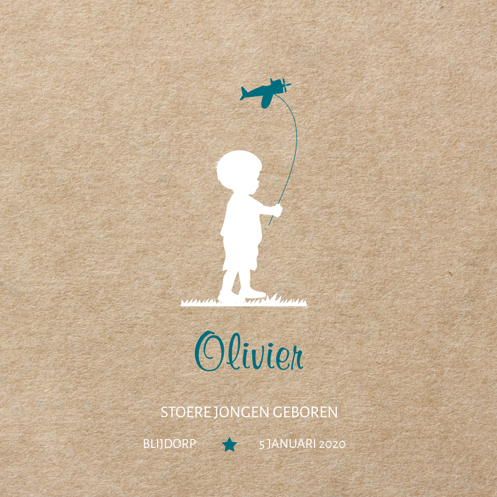 Een rustig silhouet geboortekaartje voor een jongen op een kartonnen achtergrond. Op dit silhouet kaartje Olivier staat een jongetje met een vliegtuigje aan een vlieger. Deze baby kaart is eenvoudig aan te passen.