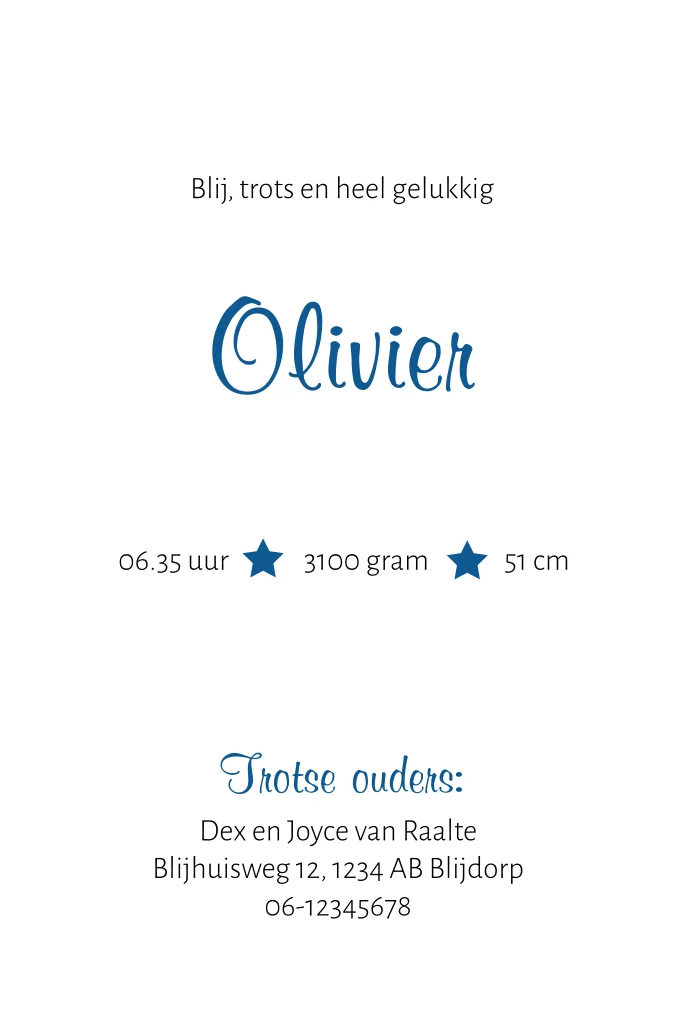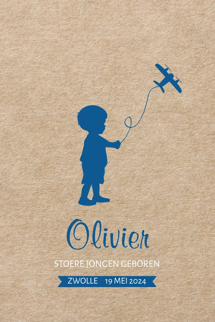 Silhouet geboortekaartje voor een jongen. Op het kaartje zie je een jongetje spelen met een vliegtuig. De achtergrond heeft een karton look. De blauwe kleur op de karton achtergrond geeft de kaart een hip Hollands tintje.