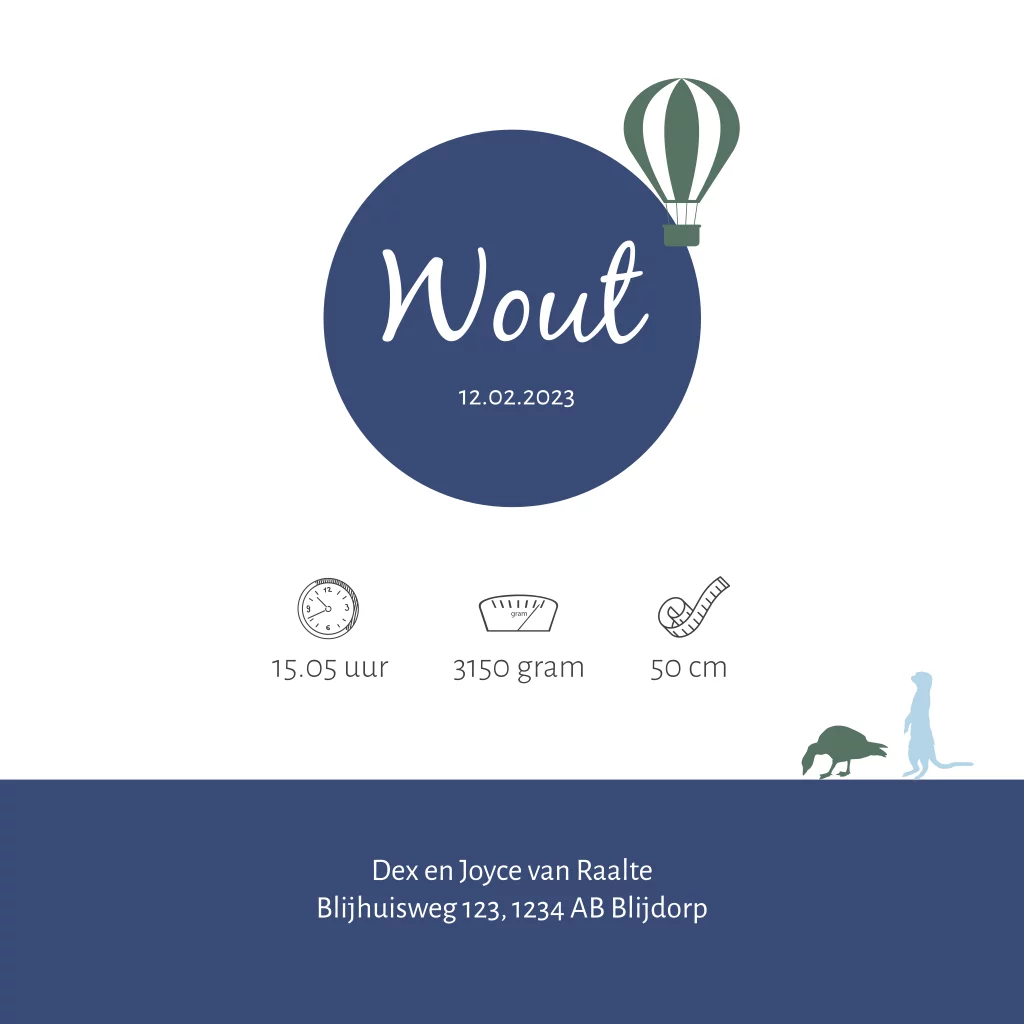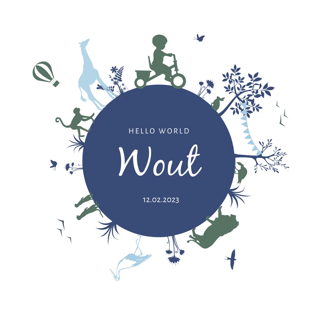 Silhouet geboortekaartje voor een jongen. Op dit kaartje Wout staat een wereldbol met daarop een jongen op een driewieler fiets en verschillende dieren, waaronder een giraffe, leeuw en aap. Teksten en kleuren, evenals het silhouet zijn aan te passen in de editor.