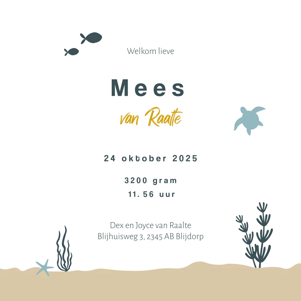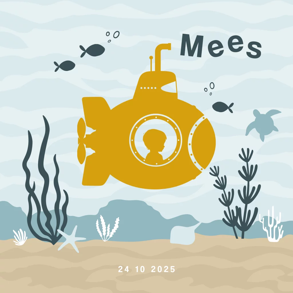 Geboortekaartje in onderwaterwereld thema met een jongetje in een onderzeeër / duikboot, zeedieren en waterplanten. Dit silhouet kaartje Mees heeft trendy kleuren en is in de editor aan te passen naar je eigen wensen.