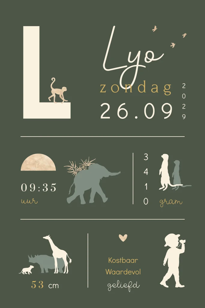 Stoer silhouet geboortekaartje voor een jongen. Op dit hippe jungle geboortekaartje Lyo staan verschillende safari en jungle dieren waaronder een giraffe, aapje, olifant en leeuw welpje. De naam, voorletter en geboortegegevens pas je zelf met een paar klikken aan in de editor. Hulp nodig? Stuur ons een berichtje.