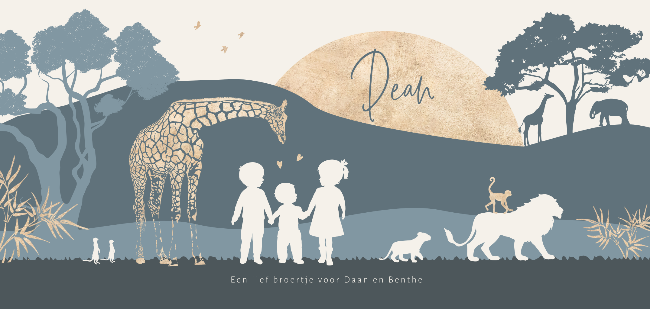 Jungle geboortekaartje met silhouetten van drie kindjes, een grote zus samen met een grote broer en een klein baby broertje. Op dit jongenskaartje Dean staan verschillende safari dieren, waaronder een giraffe, leeuw, olifant en een aapje. Op de achtergrond bomen en een heuvelachtig landschap. De babynaam staat in een goudkleurige ondergaande zon. Teksten, kleuren en de silhouetten kun je gemakkelijk aanpassen in de editor. Dit silhouet geboortekaartje is ook mogelijk voor een andere gezinssamenstelling.