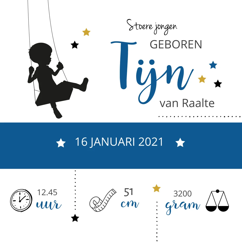 Handlettering jongens geboortekaartje met silhouet. Op het kaartje staat een jongen op een schommel en is gebruik gemaakt van handlettering of typografie. De geboorte symbolen staan op de voorkant van het kaartje en de accentkleur is donkerblauw