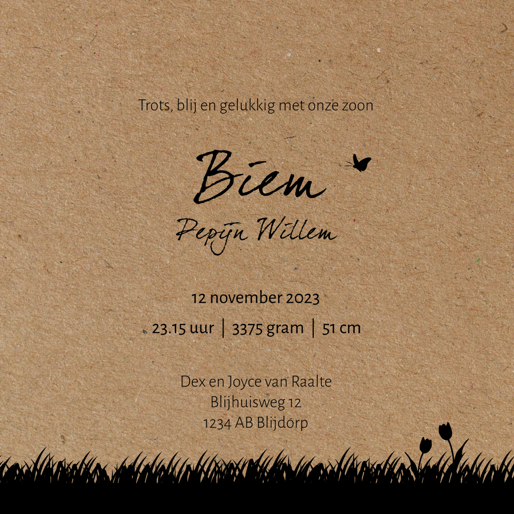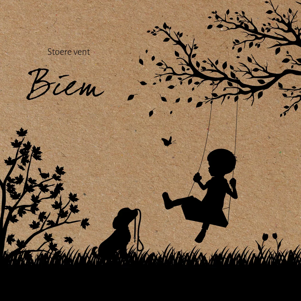 Hip silhouet geboortekaartje voor een jongen op een karton achtergrond. Een mooie combinatie met de afbeeldingen en teksten in de kleur zwart. Op dit babykaartje Biem staat een jongen op de schommel en het silhouet van een hond.