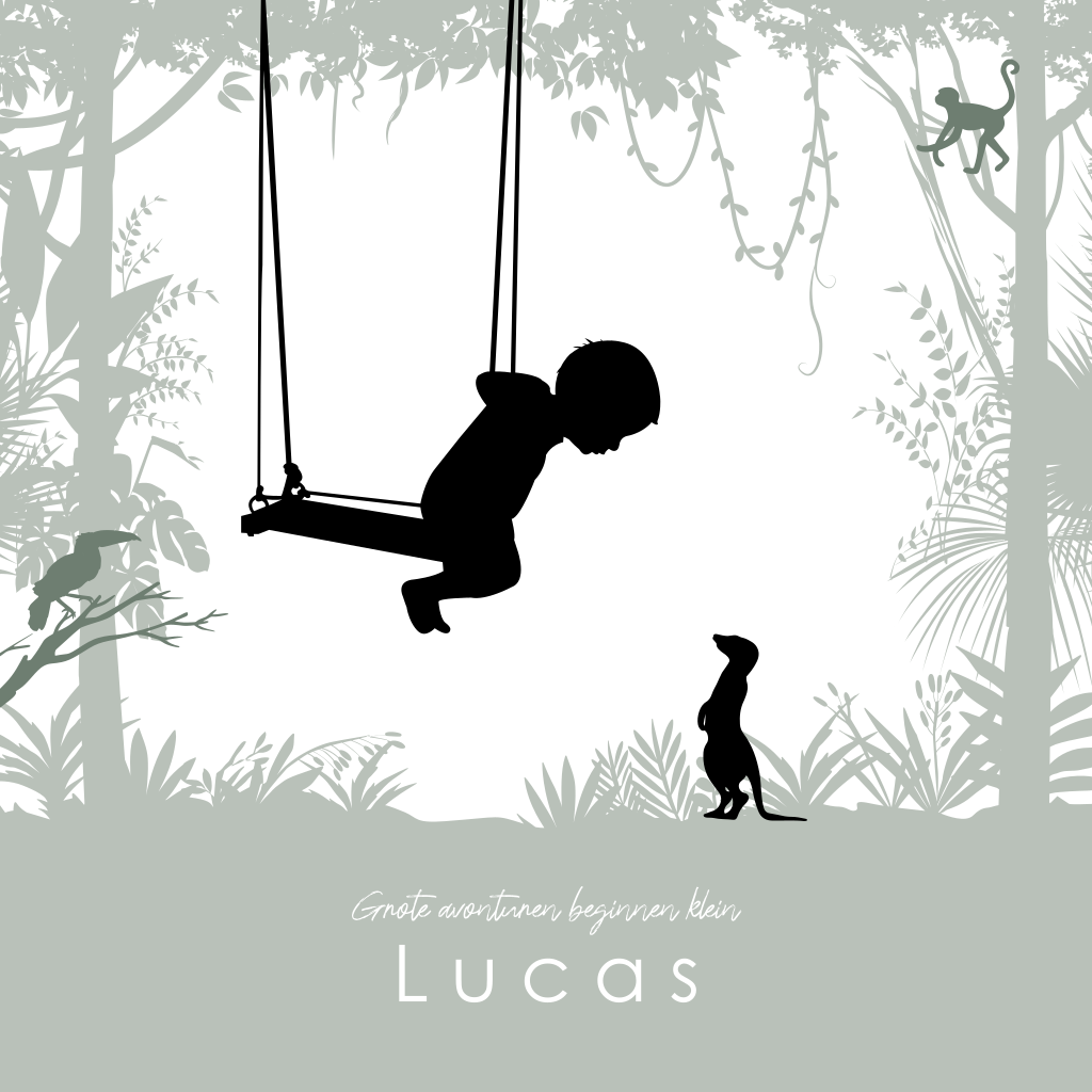 Silhouet geboortekaartje met een jongetje op een schommel in de tropische jungle. Verder op dit kaartje Lucas een stokstaartje, toekan en een aapje.