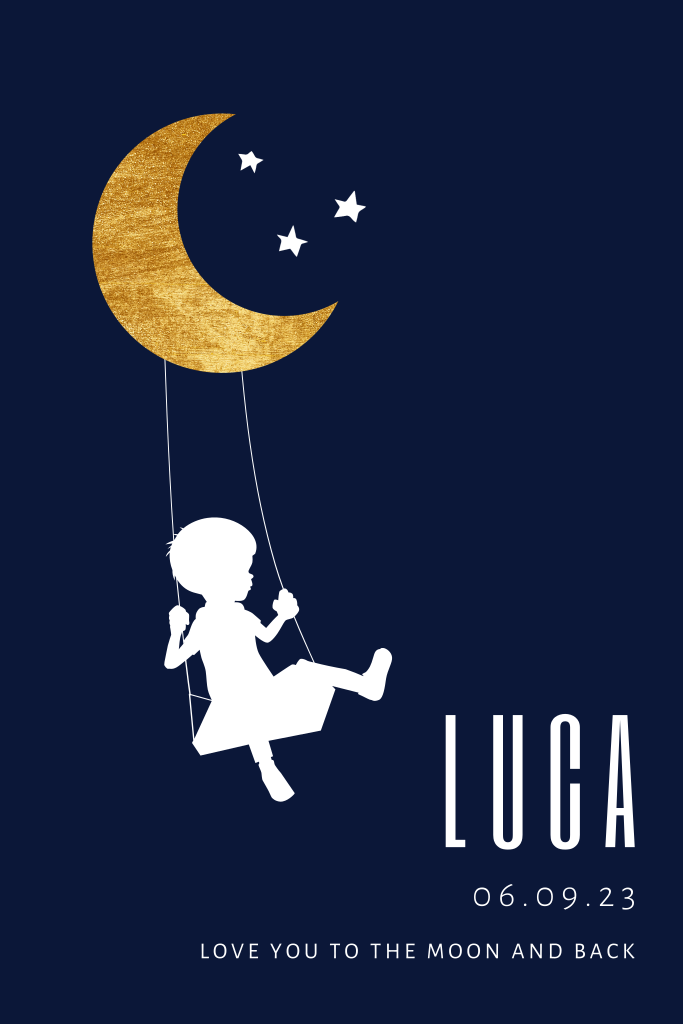 Hip geboortekaartje met een maan en het silhouet van een jongen op de schommel. De maan en de sterretjes blinken tegen de mooie donkerblauwe achtergrond. Love you to the moon and back! De kleuren van dit kaartje Luca zijn aan te passen in de editor.