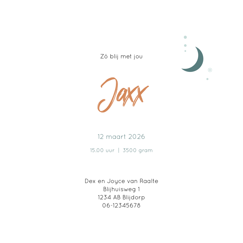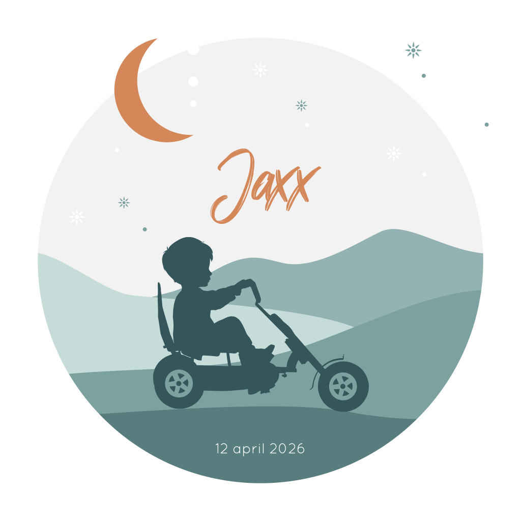Stoer silhouet geboortekaartje voor jullie zoon! Op dit babykaartje Jaxx een jongen op een skelter in een glooiend landschap in trendy blauwtinten. Deze afbeelding is geplaatst in een cirkelvormig kader. Teksten, kleuren, lettertypes en/of silhouet pas je eenvoudig aan in de editor.