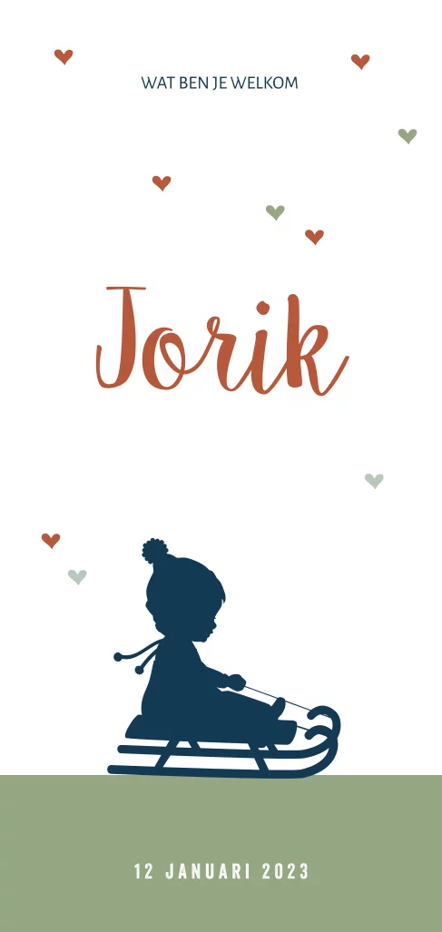 Hip silhouet geboortekaartje voor een jongen. Dit kaartje Jorik heeft een winterse sfeer met een silhouet van een jongen op de slee. De gebruikte kleuren zijn olijf groen met donkerblauw en koperkleur. De kleine hartjes maken het kaartje af.