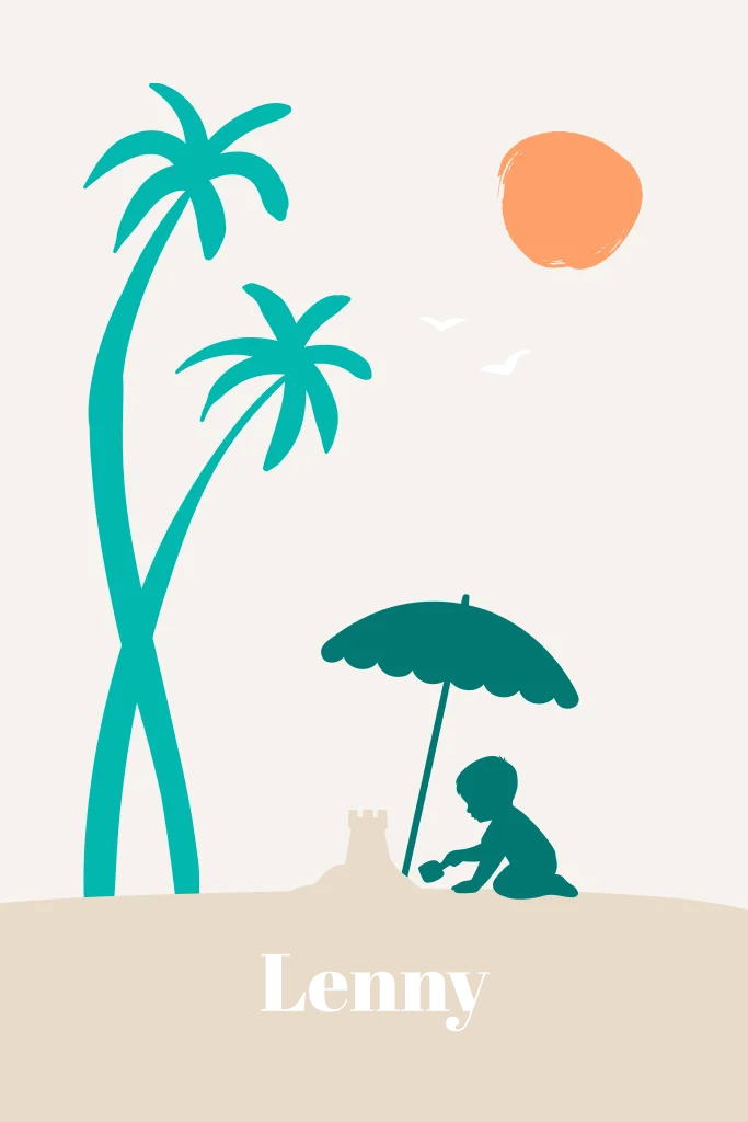 Silhouet geboortekaartje voor een jongen. Op dit geboortekaartje Lenny zie je een jongetje spelen met het zand op het strand. Op de achtergrond zie je palmbomen met de zon, een echt zomers kaartje voor een zomerbaby! De ronde hoeken en foliedruk geven een speelse en luxe touch. Dit silhouet kaartje is gemakkelijk aan te passen en ook mogelijk in een andere gezinssamenstelling. Hulp nodig? Neem contact met ons op!