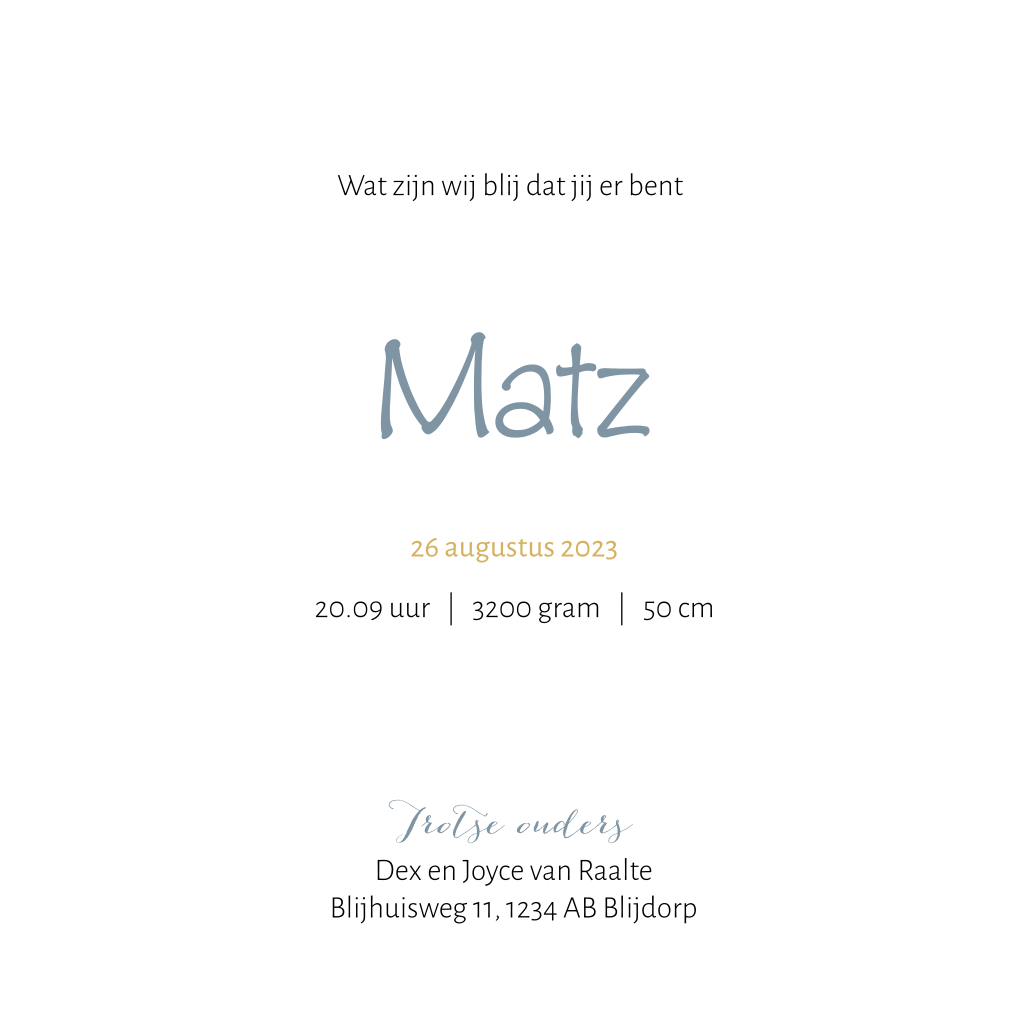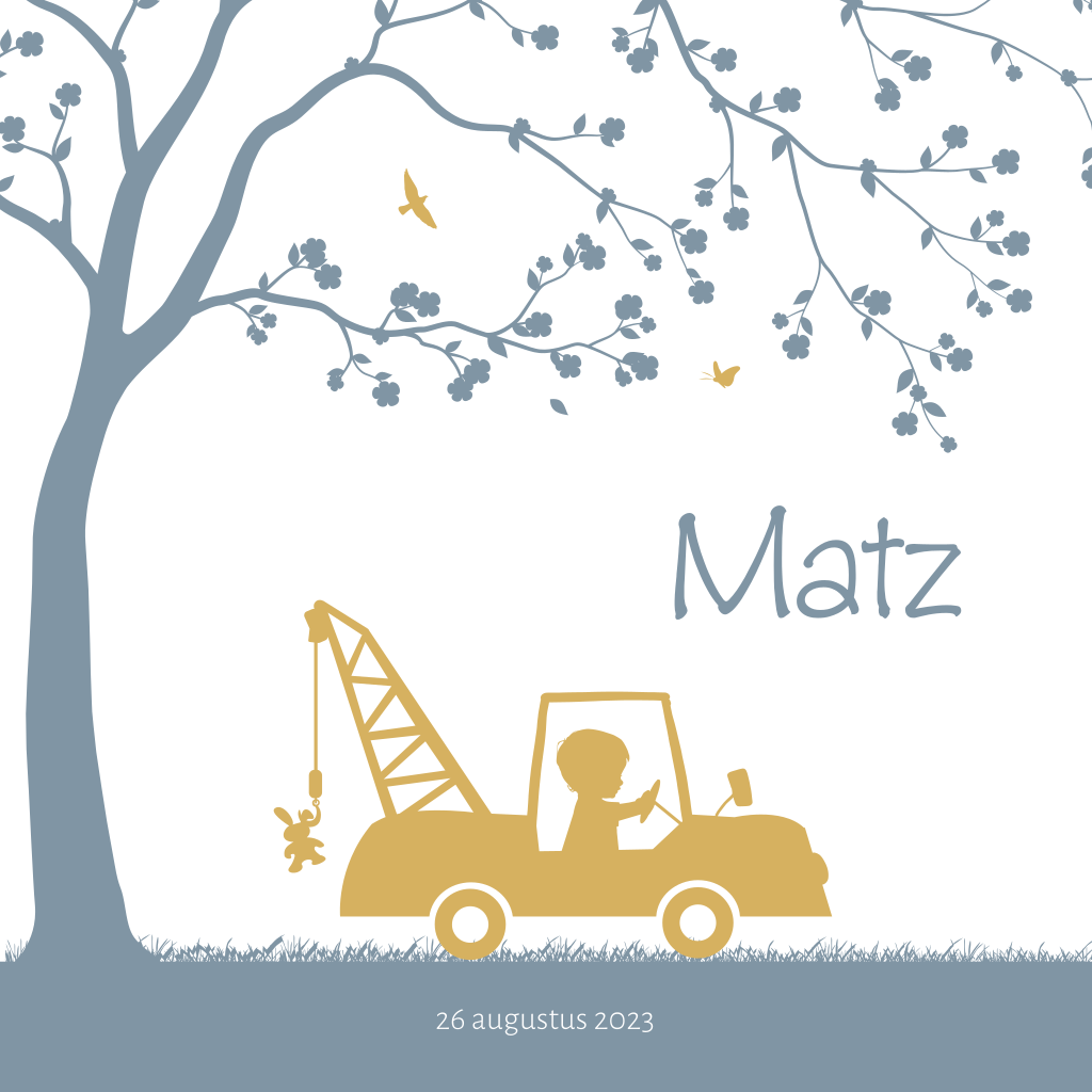 Lief geboortekaartje Matz voor een zoon met het silhouet van een jongetje in een stoere takelwagen. Verder op dit kaartje een boom, knuffeltje, vogel en vlinder. Pas de kleuren en teksten naar wens aan in de editor. Ook mogelijk met een ander silhouet.