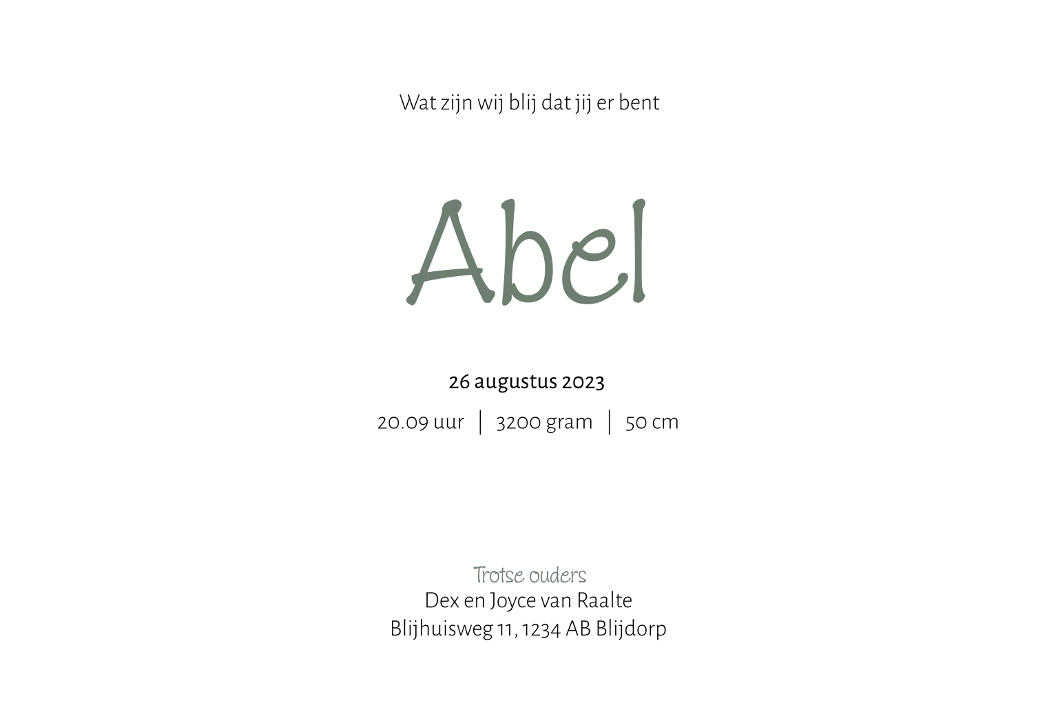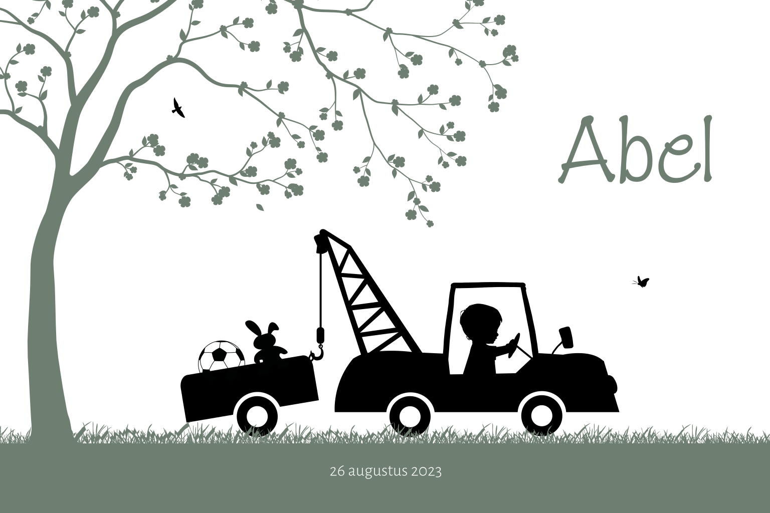 Silhouet geboortekaartje voor een zoon. Op dit kaartje Abel staat een jongetje in een stoere takelwagen met kar met een knuffeltje en een bal erin. Pas dit kaartje naar je eigen wensen aan in de editor.